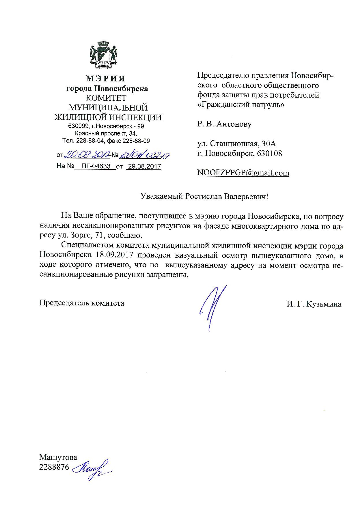 Номер жалобы:23777 Тип жалобы:Иные проблемы ЖКХ Название объекта:Управляющая Компания Город:Новосибирск Адрес:Новосибирск, улица Зорге, 71 Описание жалобы:Фасад дома разрисован Статус: