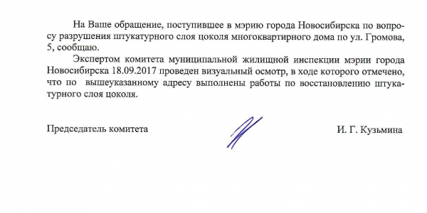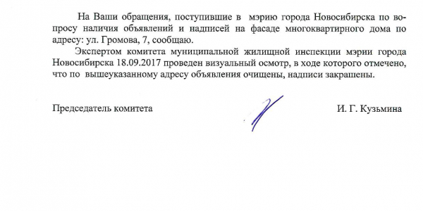 Номер жалобы:23773 Тип жалобы:Иные проблемы ЖКХ Название объекта:Управляющая Компания Город:Новосибирск Адрес:Новосибирск, улица Громова, 7 Описание жалобы:Громова 7,фасад разрисован Статус: