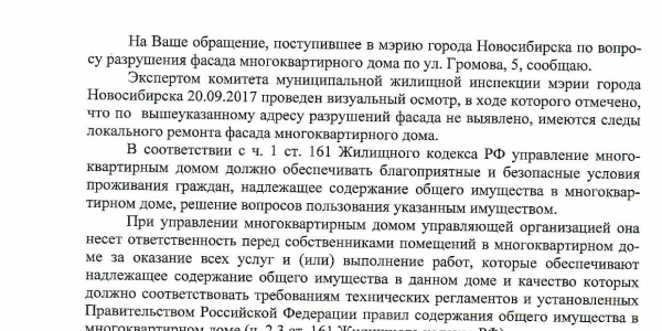 Номер жалобы:23775 Тип жалобы:Иные проблемы ЖКХ Название объекта:Управляющая Компания Город:Новосибирск Адрес:Новосибирск, улица Громова, 5 Описание жалобы:Фасад дома рушится Статус: