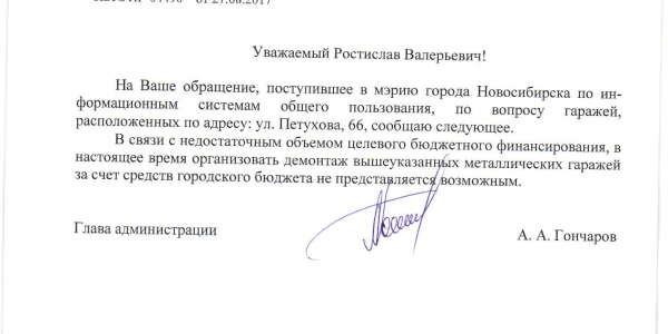 Номер жалобы:23714 Тип жалобы:Иные проблемы ЖКХ Название объекта:Управляющая Компания Город:Новосибирск Адрес:Новосибирск, улица Петухова, 66 Описание жалобы:Гаражи Статус: