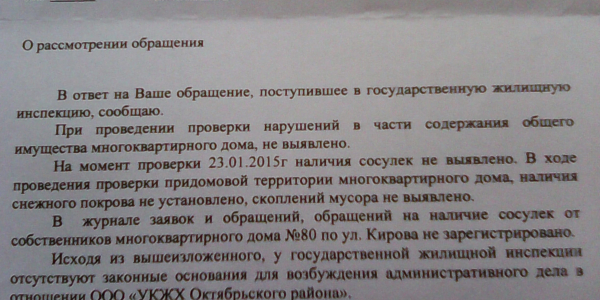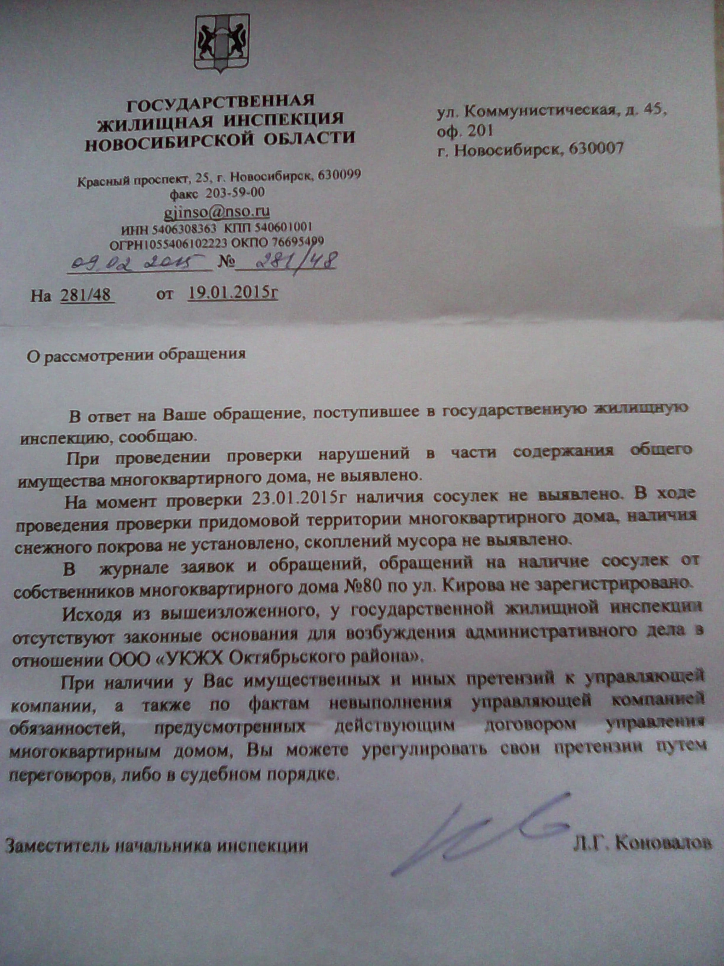 Номер жалобы:779 Тип жалобы:Качество уборки снега на дорогах Название объекта:Ужкх Октябрьского Района Город:Новосибирск Адрес:ул. Кирова 80 Описание жалобы:Сосулька около 3х метров длиной и объемом литров 200. Если упадет, может когонибудь покалечить. Статус: