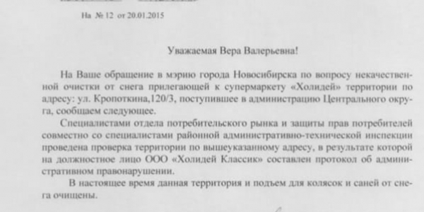 Номер жалобы:775 Тип жалобы:Качество уборки снега на дорогах Название объекта:Холидей Город:Новосибирск Адрес:ул. Кропоткина 120/3 Описание жалобы:засыпали подъем для колясок и санок Статус: