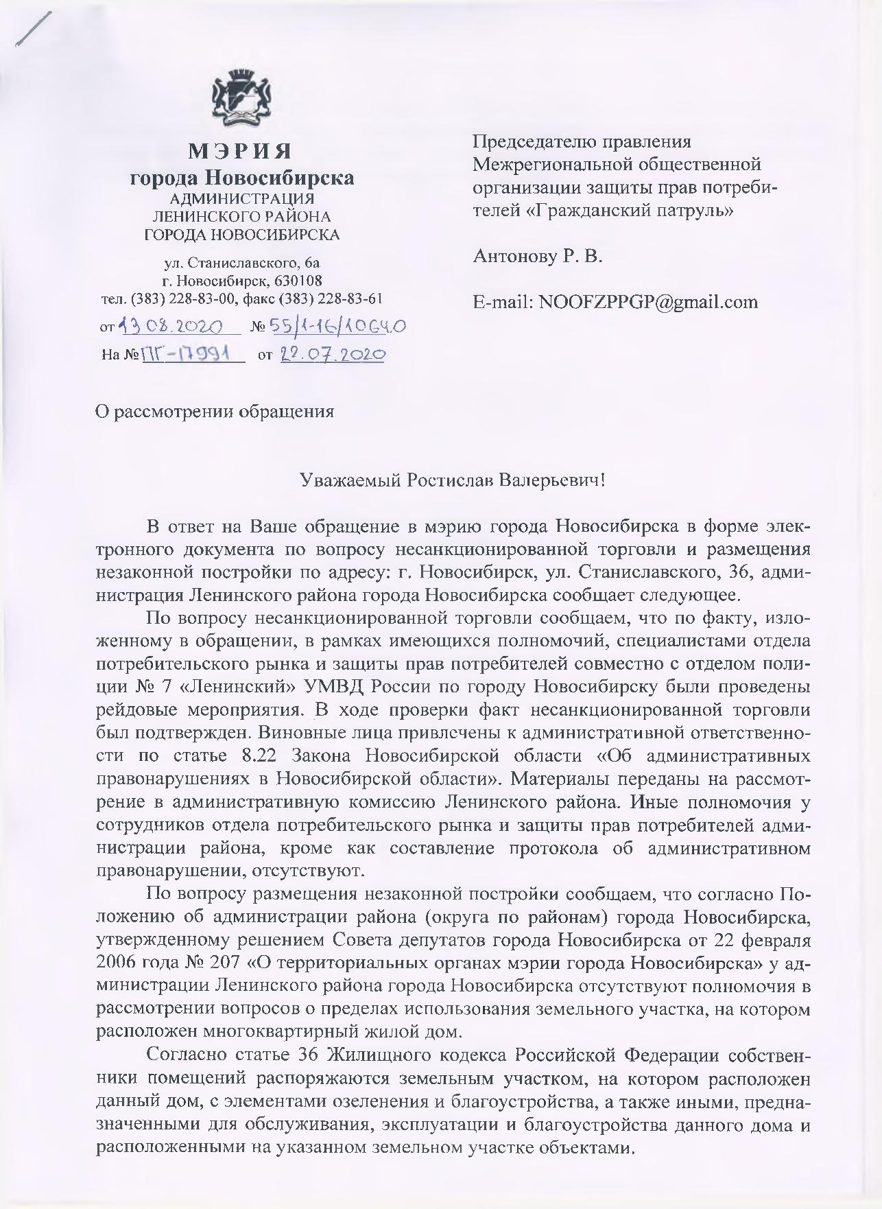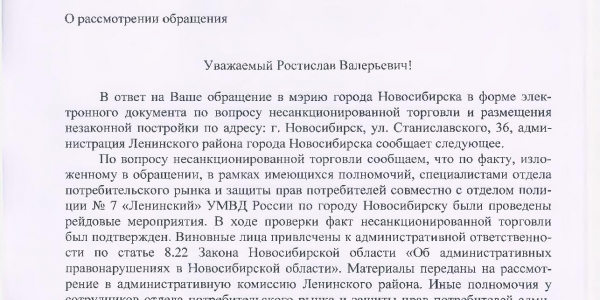 Номер жалобы:67348 Тип жалобы:Прочее Название объекта: Регион:Новосибирская область Город:Новосибирск Адрес:улица Станиславского, 36 Описание жалобы:66349. Повторное обращение. Незаконная торговля. Незаконная постройка. Препятствие проходу пешеходам. Статус: