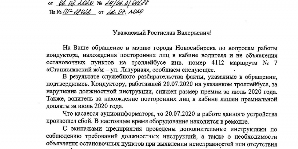 Номер жалобы:67346 Тип жалобы:Прочее Название объекта: Регион:Новосибирская область Город:Новосибирск Адрес:площадь Карла Маркса Описание жалобы:Кондуктор спит, автоинформатор не работает, остановки не объявляют. Посторонние мешают водителю в кабине (водитель с кондуктором другого экипажа).