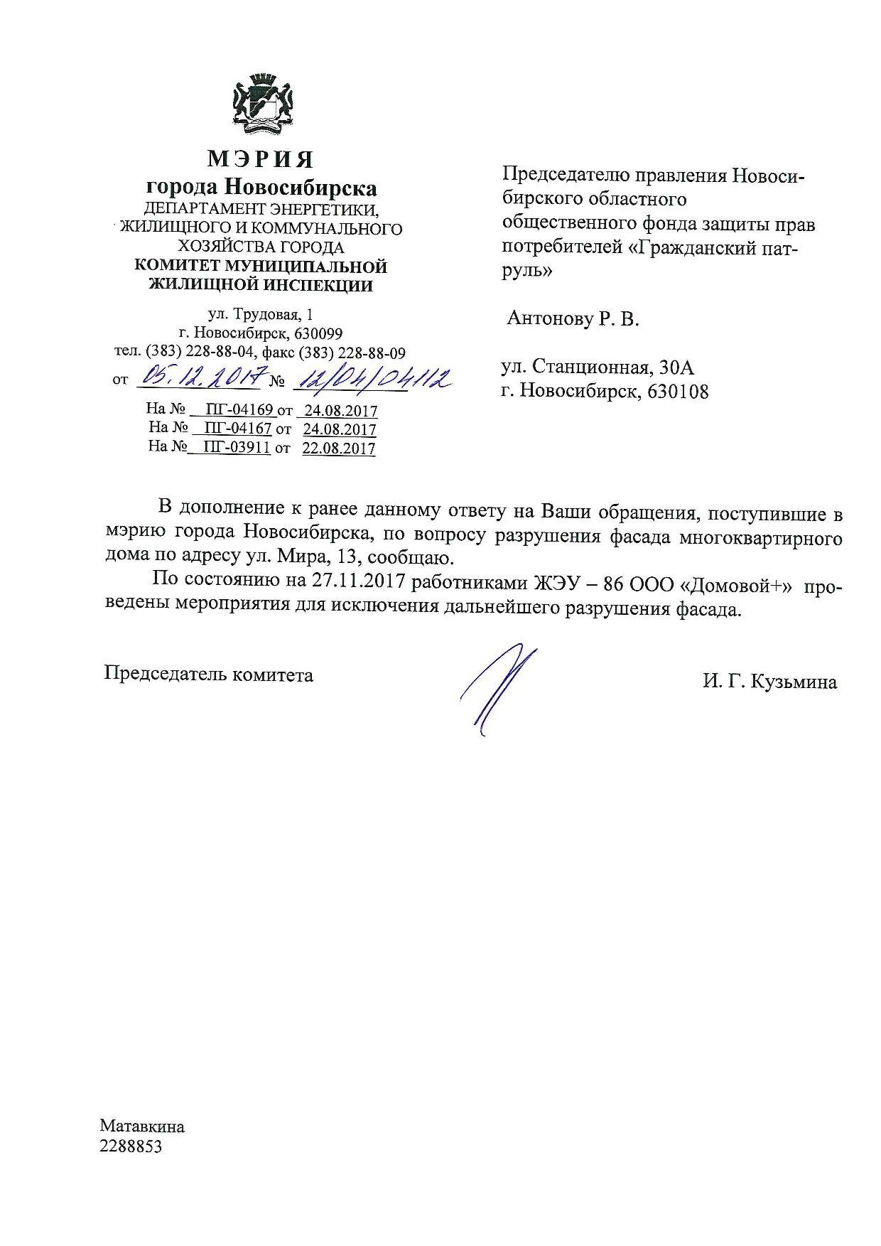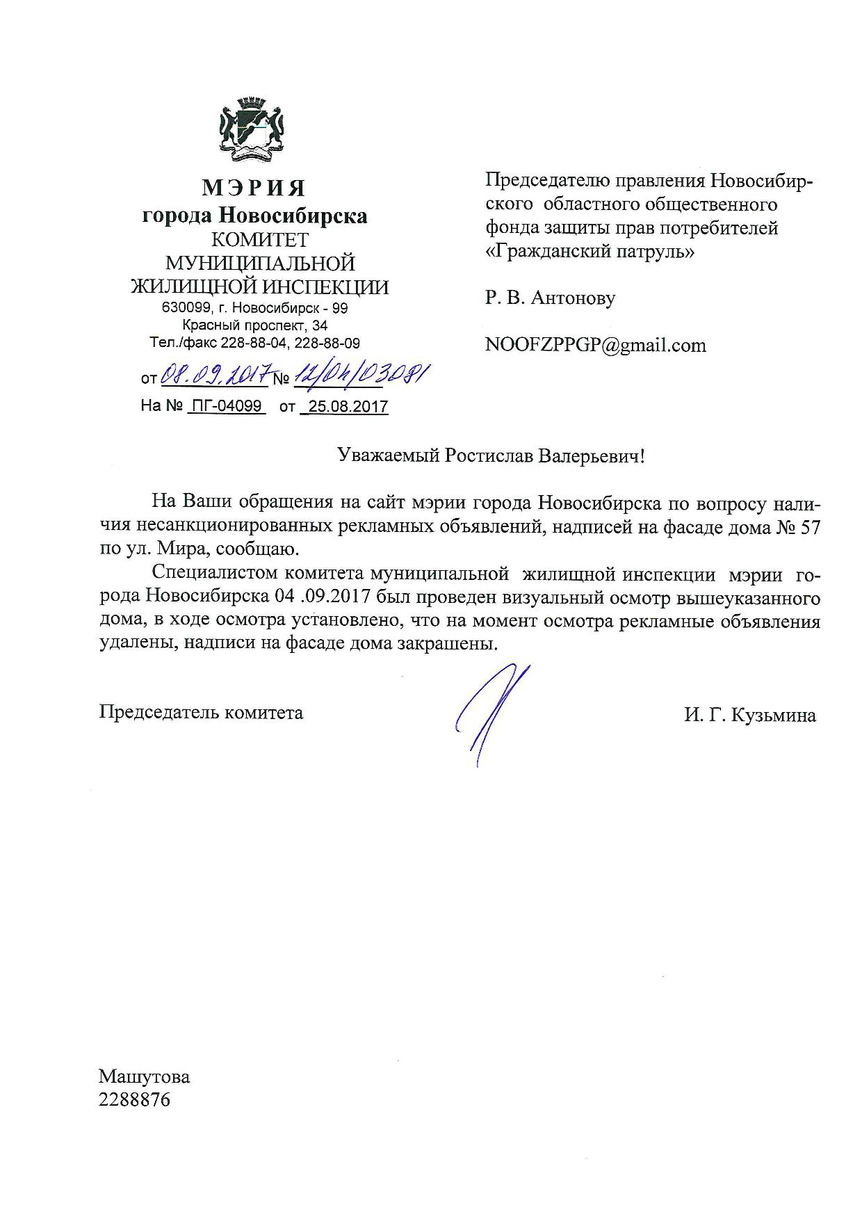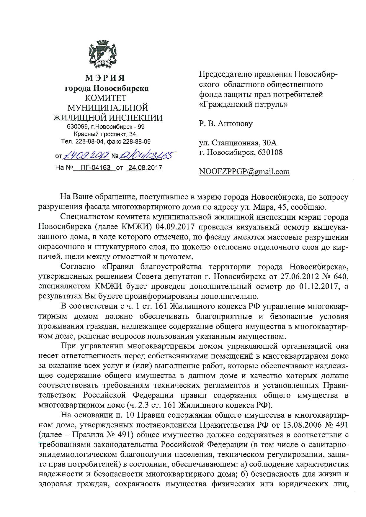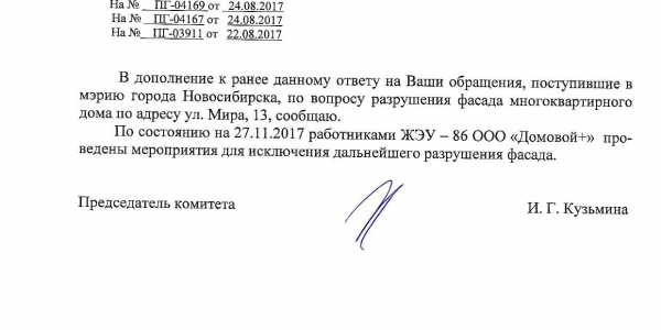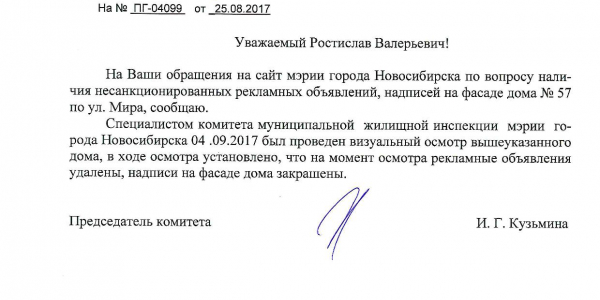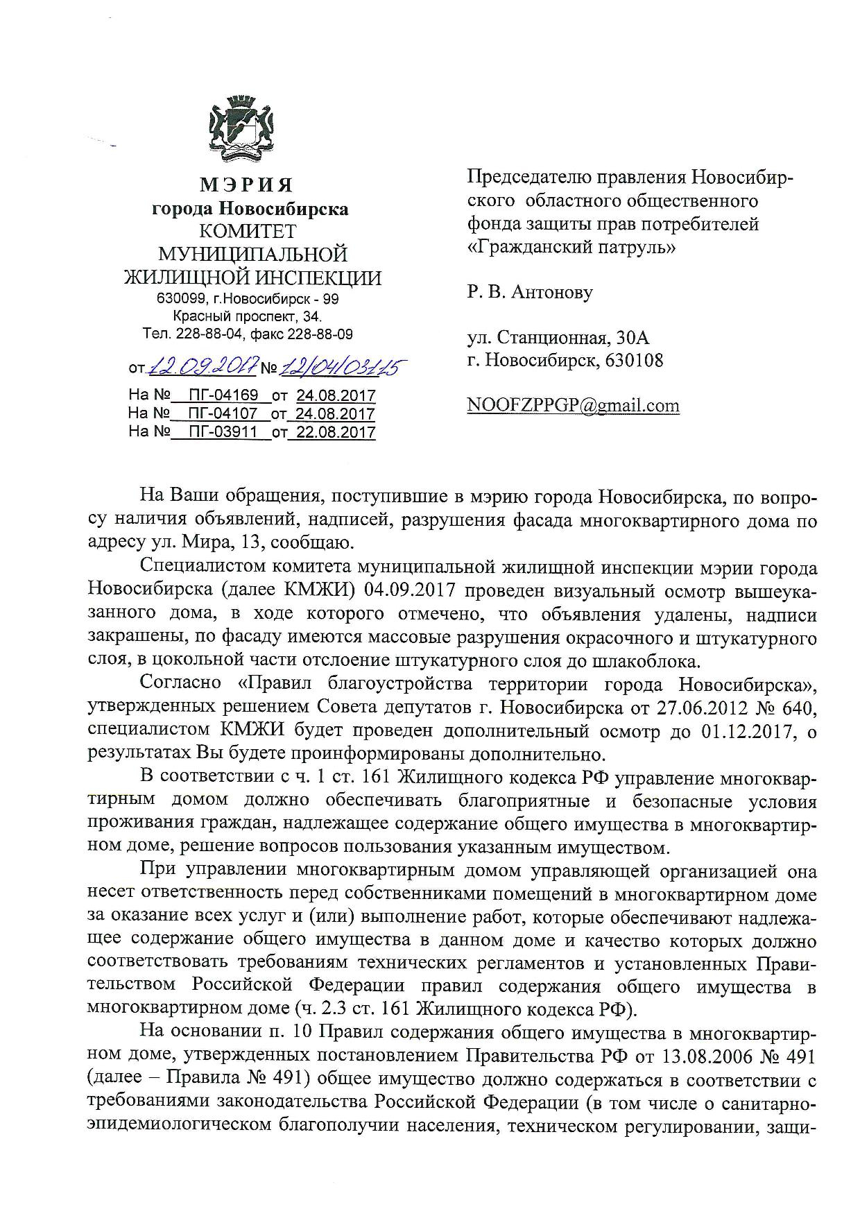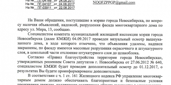 Номер жалобы:23364 Тип жалобы:Иные проблемы ЖКХ Название объекта:Управляющая Компания Город:Новосибирск Адрес:Новосибирск, улица Мира, 13 Описание жалобы:Фасад разрисован Статус: