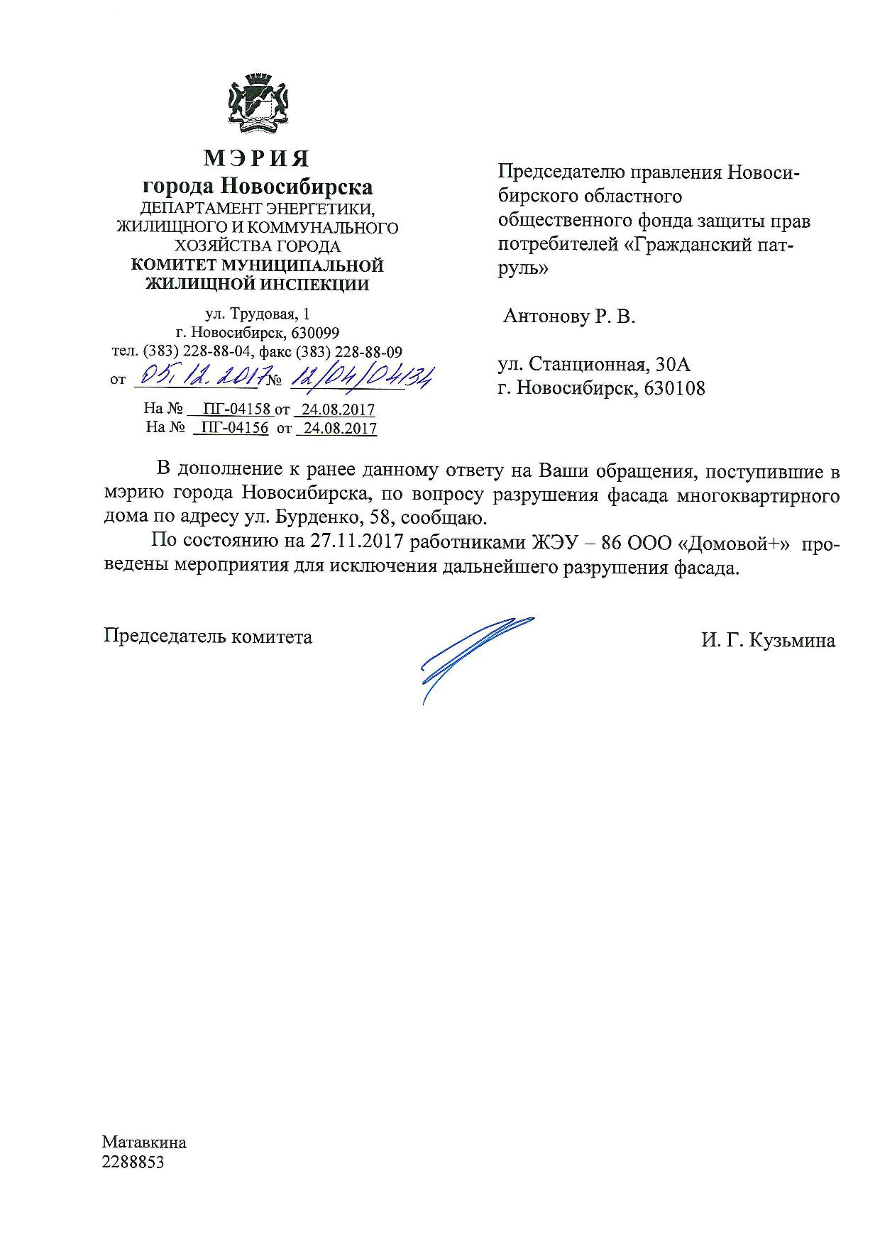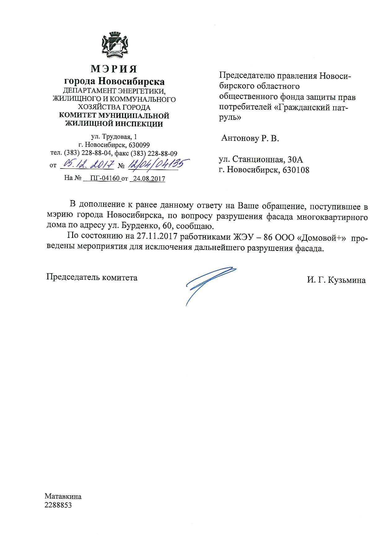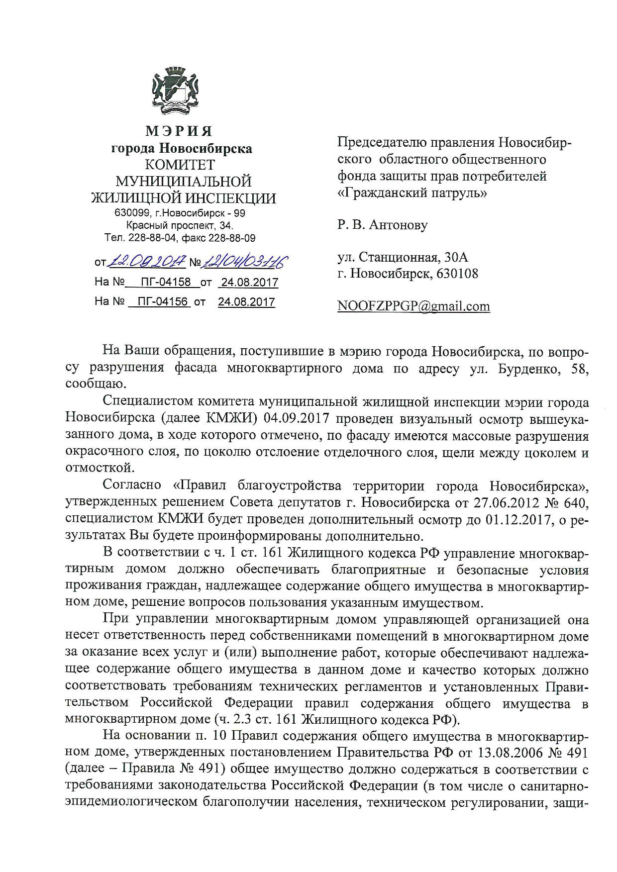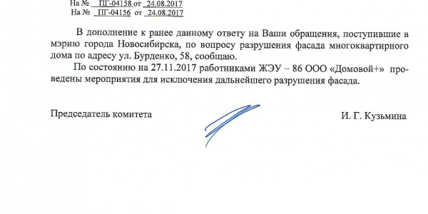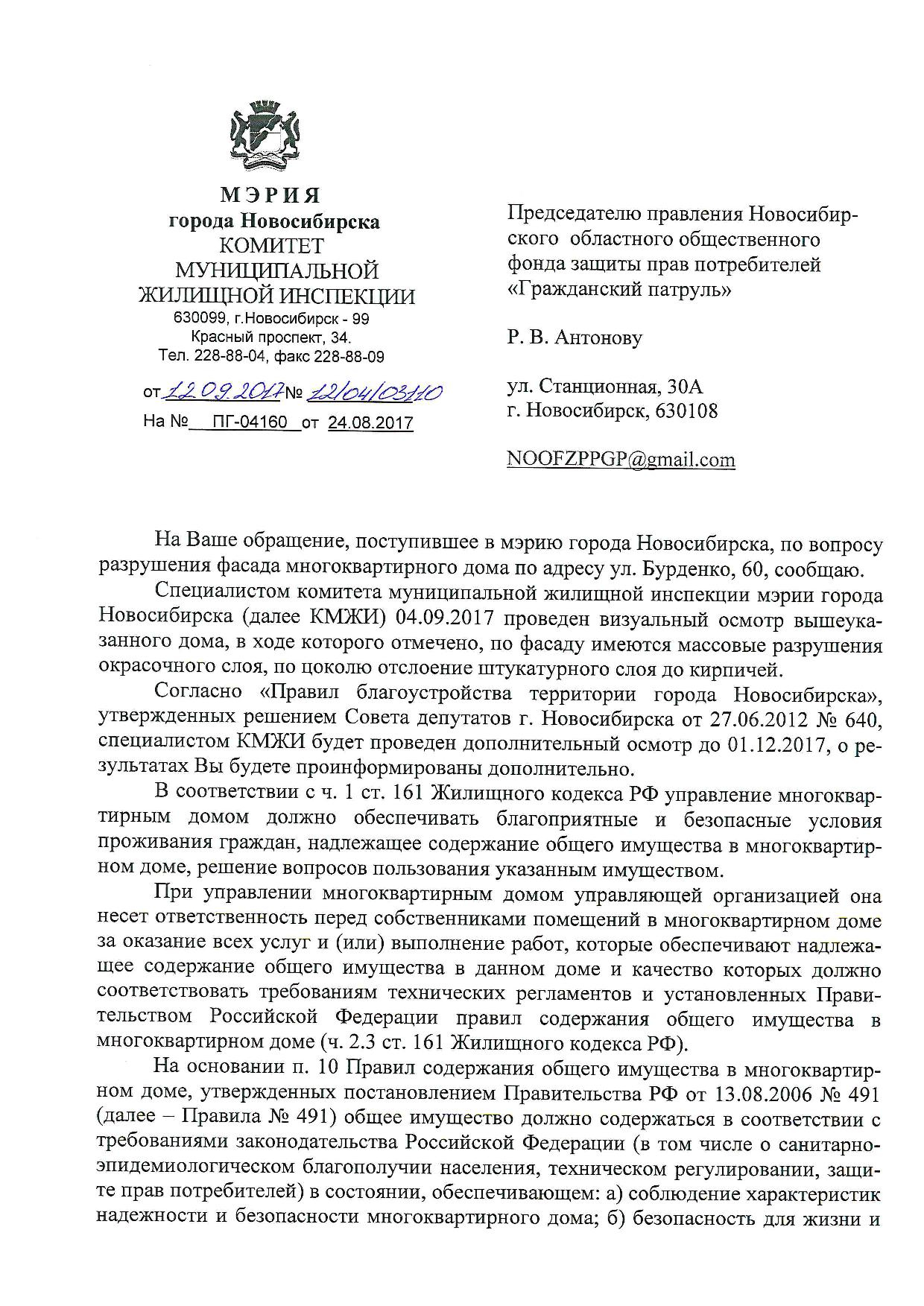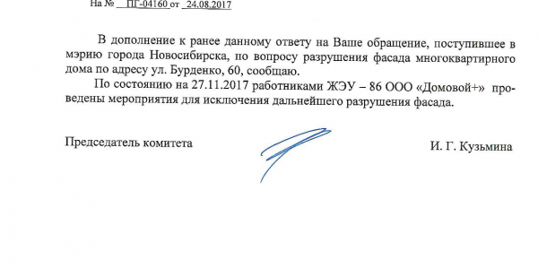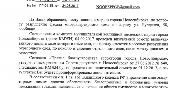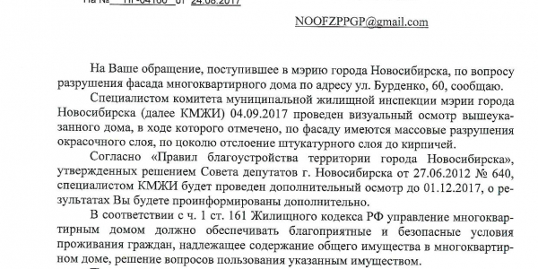 Номер жалобы:23354 Тип жалобы:Иные проблемы ЖКХ Название объекта:Управляющая Компания Город:Новосибирск Адрес:Новосибирск, улица Бурденко, 60 Описание жалобы:Фасад дома Статус: