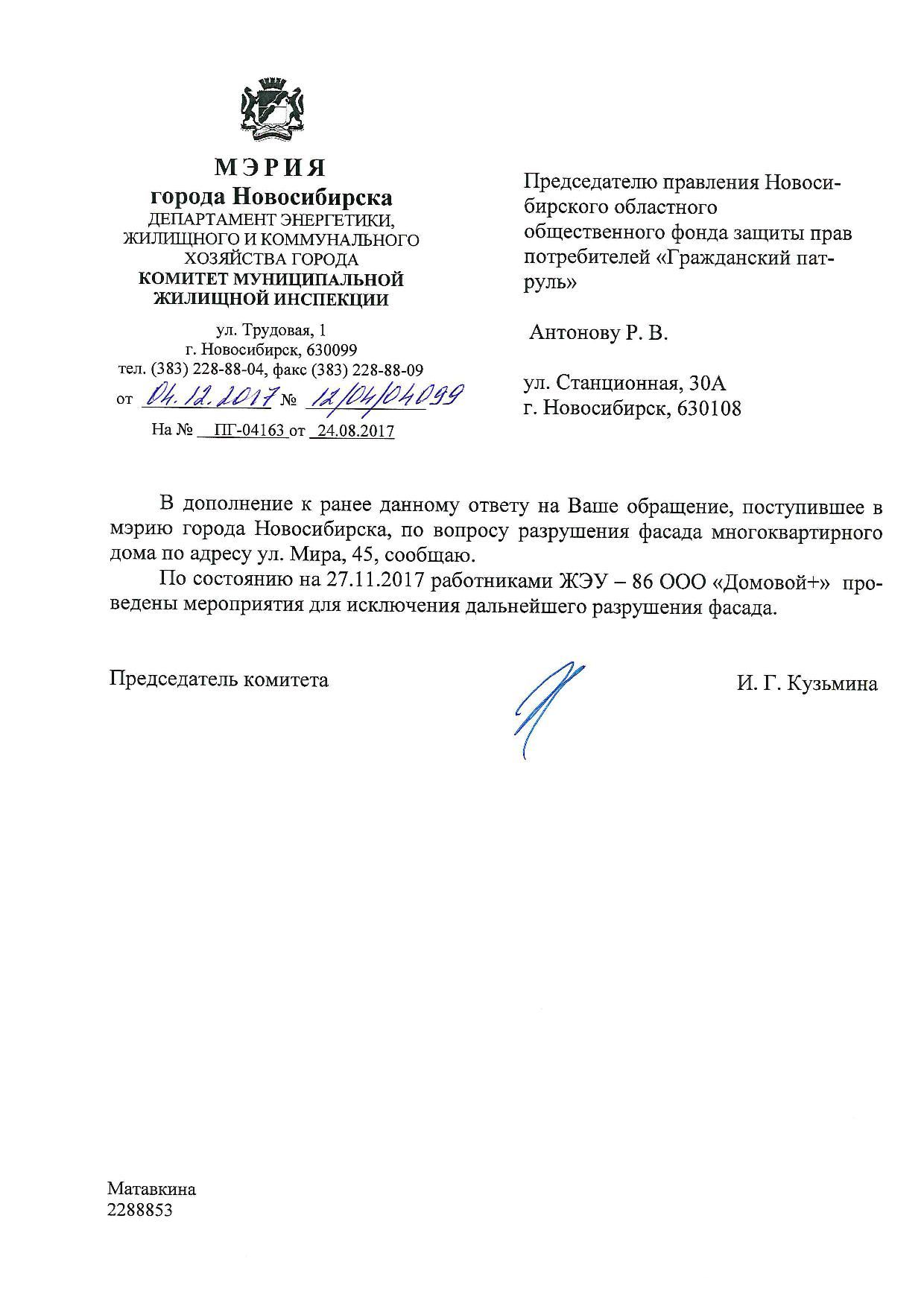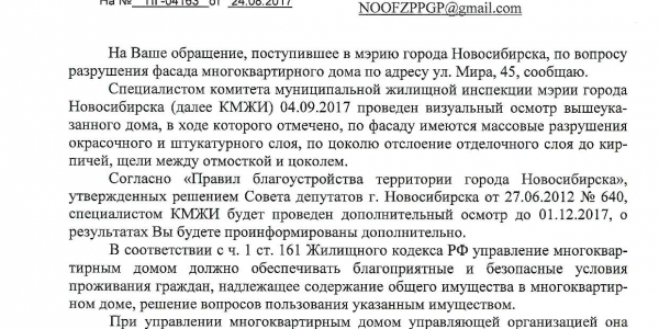 Номер жалобы:23360 Тип жалобы:Иные проблемы ЖКХ Название объекта:Управляющая Компания Город:Новосибирск Адрес:Новосибирск, улица Мира, 45 Описание жалобы:Отваливающаяся штукатурка Статус: