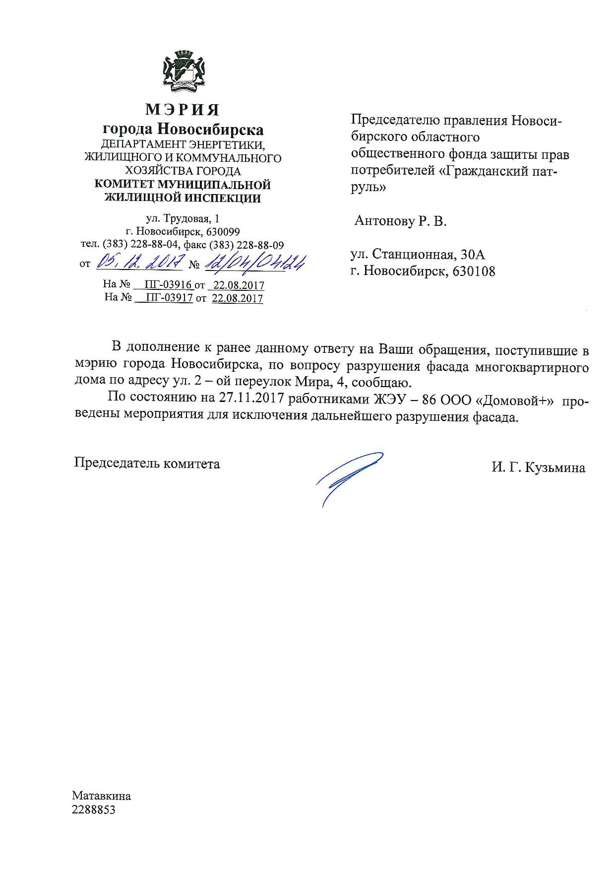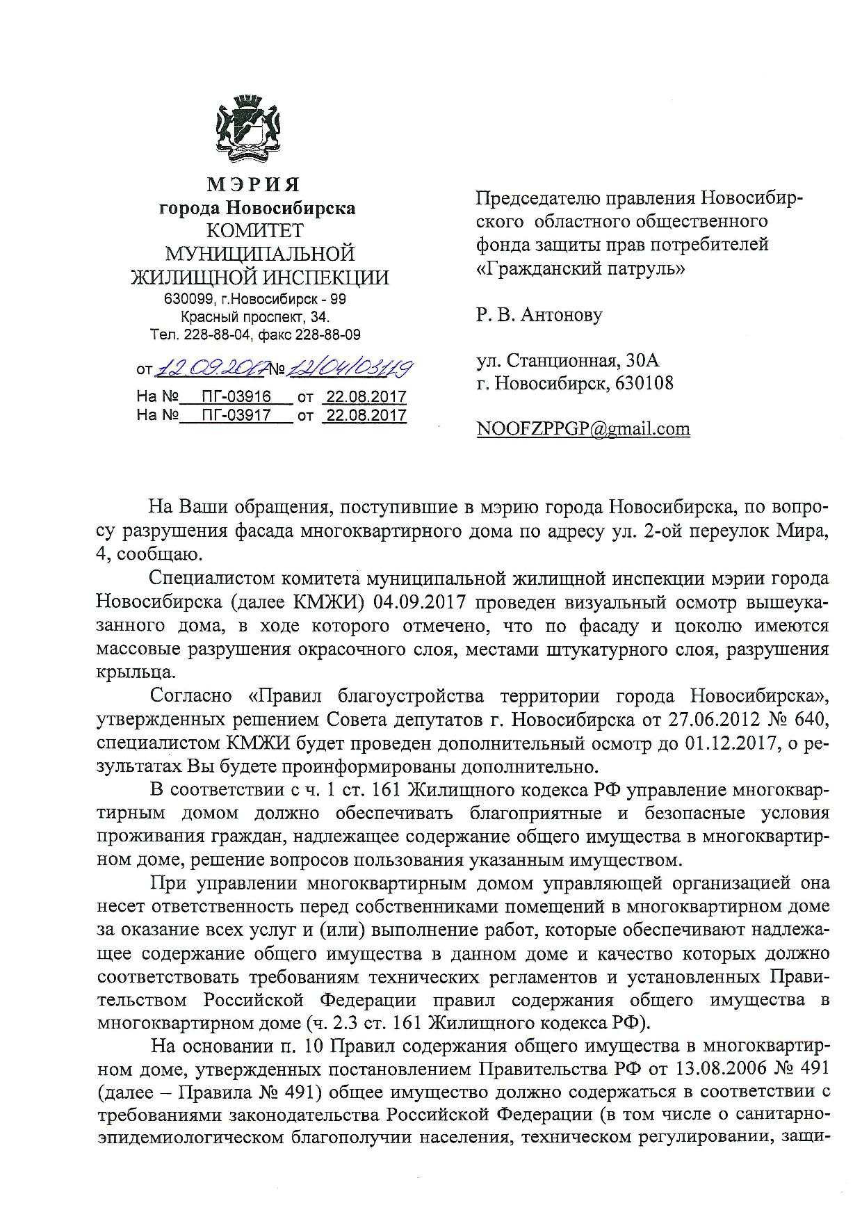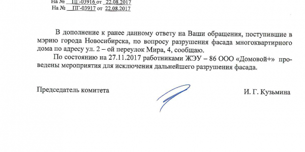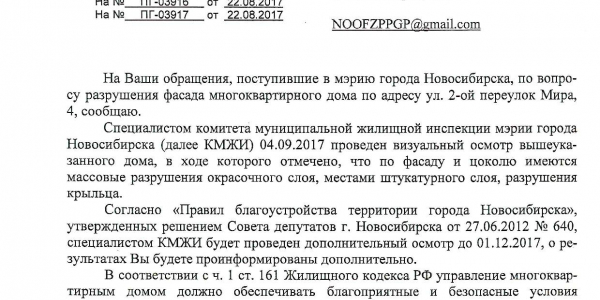Номер жалобы:23303 Тип жалобы:Иные проблемы ЖКХ Название объекта:Управляющая Компания Город:Новосибирск Адрес:Новосибирск, 2-й Мира переулок, 4 Описание жалобы:Разрушенный фасад Статус: