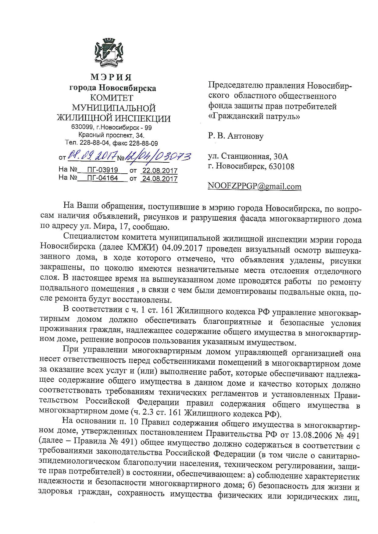 Номер жалобы:23306 Тип жалобы:Иные проблемы ЖКХ Название объекта:Управляющая Компания Город:Новосибирск Адрес:Новосибирск, улица Мира, 17 Описание жалобы:Комментарий Статус: