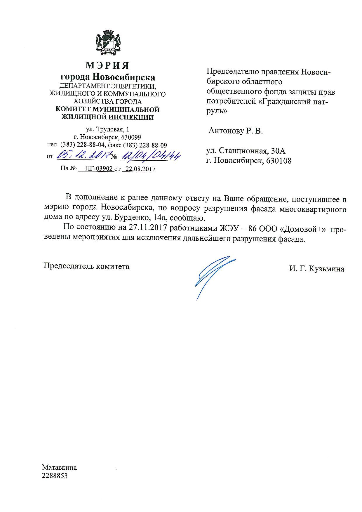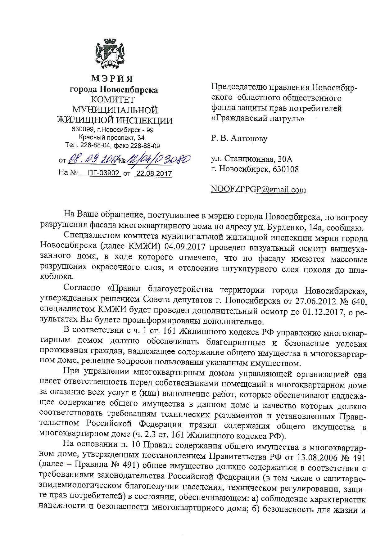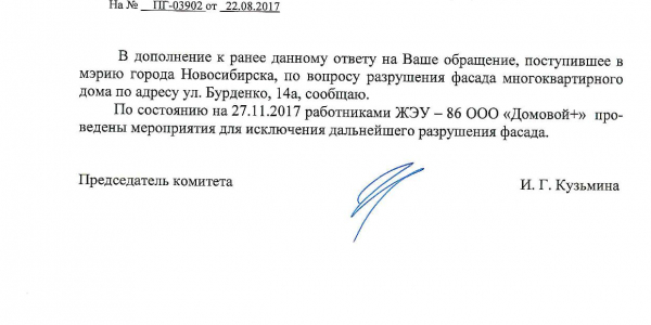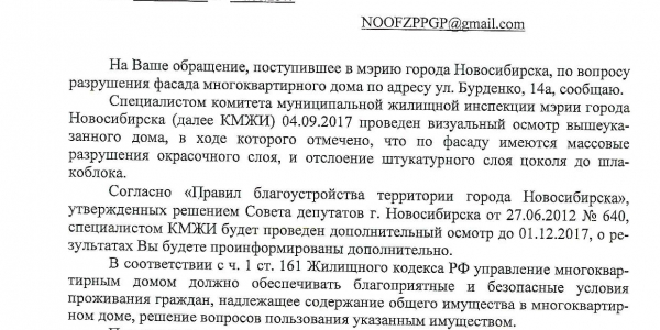 Номер жалобы:23309 Тип жалобы:Иные проблемы ЖКХ Название объекта:Управляющая Компания Город:Новосибирск Адрес:Новосибирск, улица Бурденко, 14А Описание жалобы:Разрушенный фасад дома Статус: