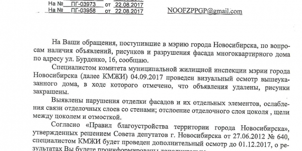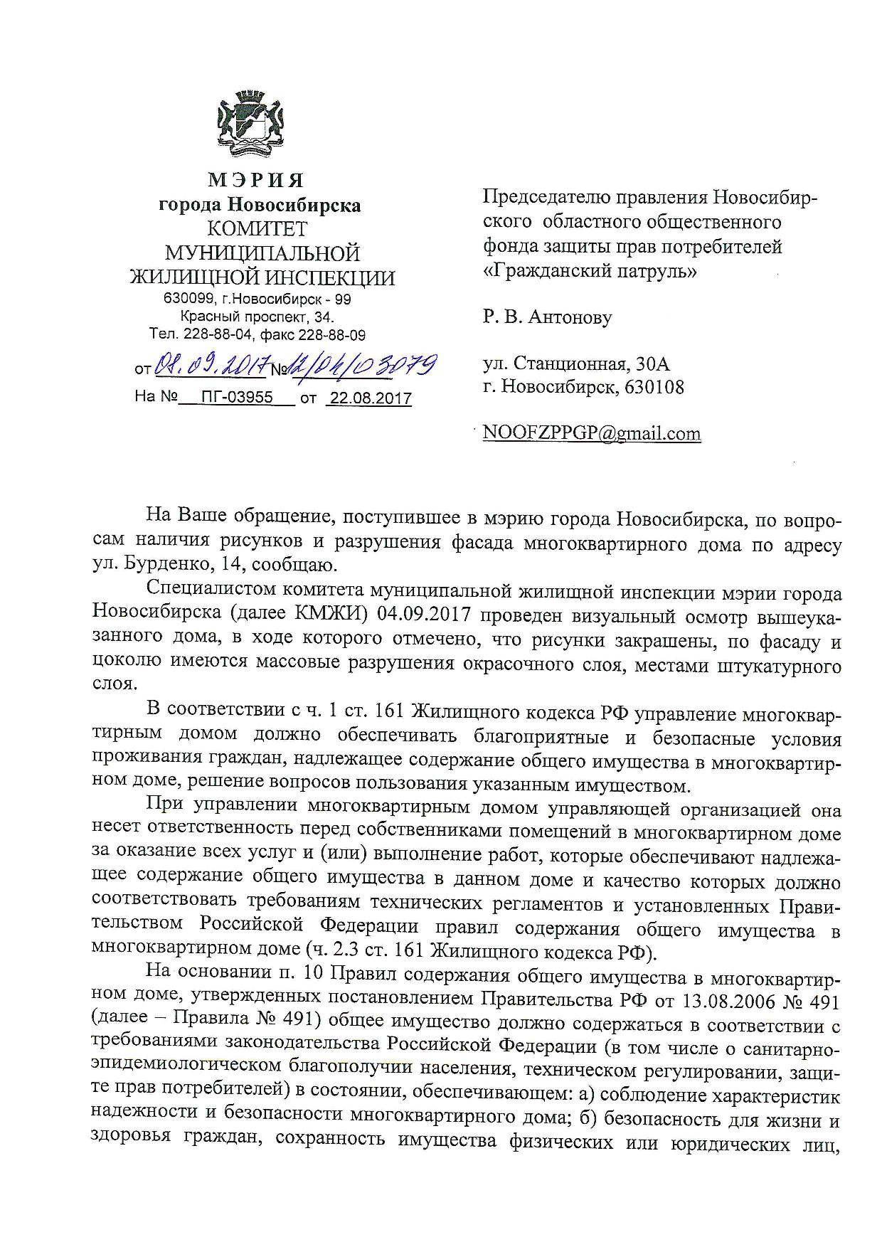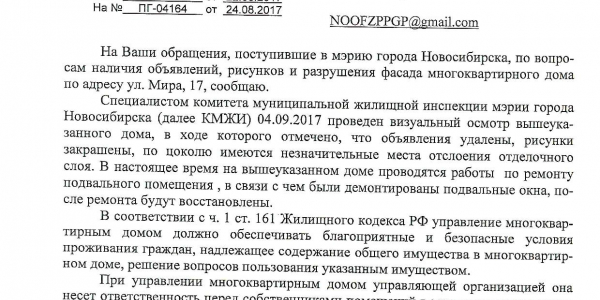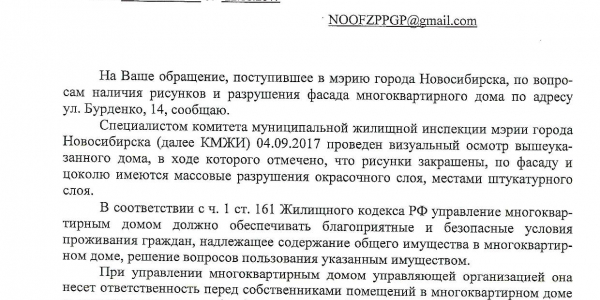 Номер жалобы:23319 Тип жалобы:Иные проблемы ЖКХ Название объекта:Управляющая Компания Город:Новосибирск Адрес:Новосибирск, улица Бурденко, 18 Описание жалобы:Разрисованный фасад дома Статус: