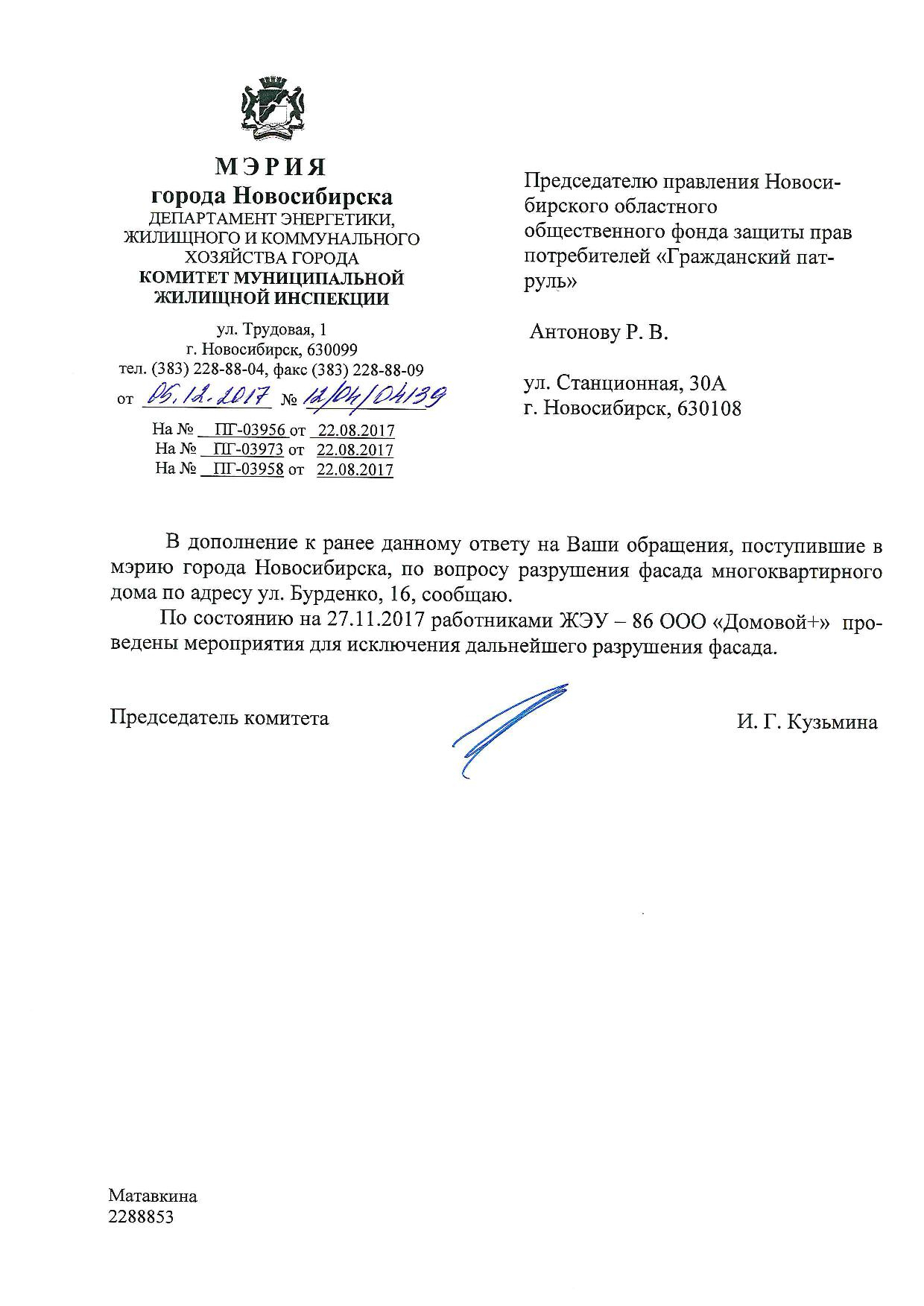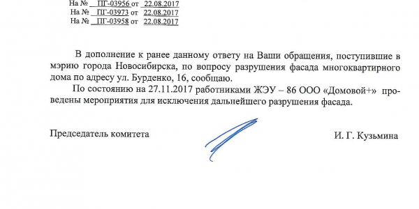 Номер жалобы:23313 Тип жалобы:Иные проблемы ЖКХ Название объекта:Управляющая Компания Город:Новосибирск Адрес:Новосибирск, улица Бурденко, 16 Описание жалобы:Рушится фасад дома Статус: