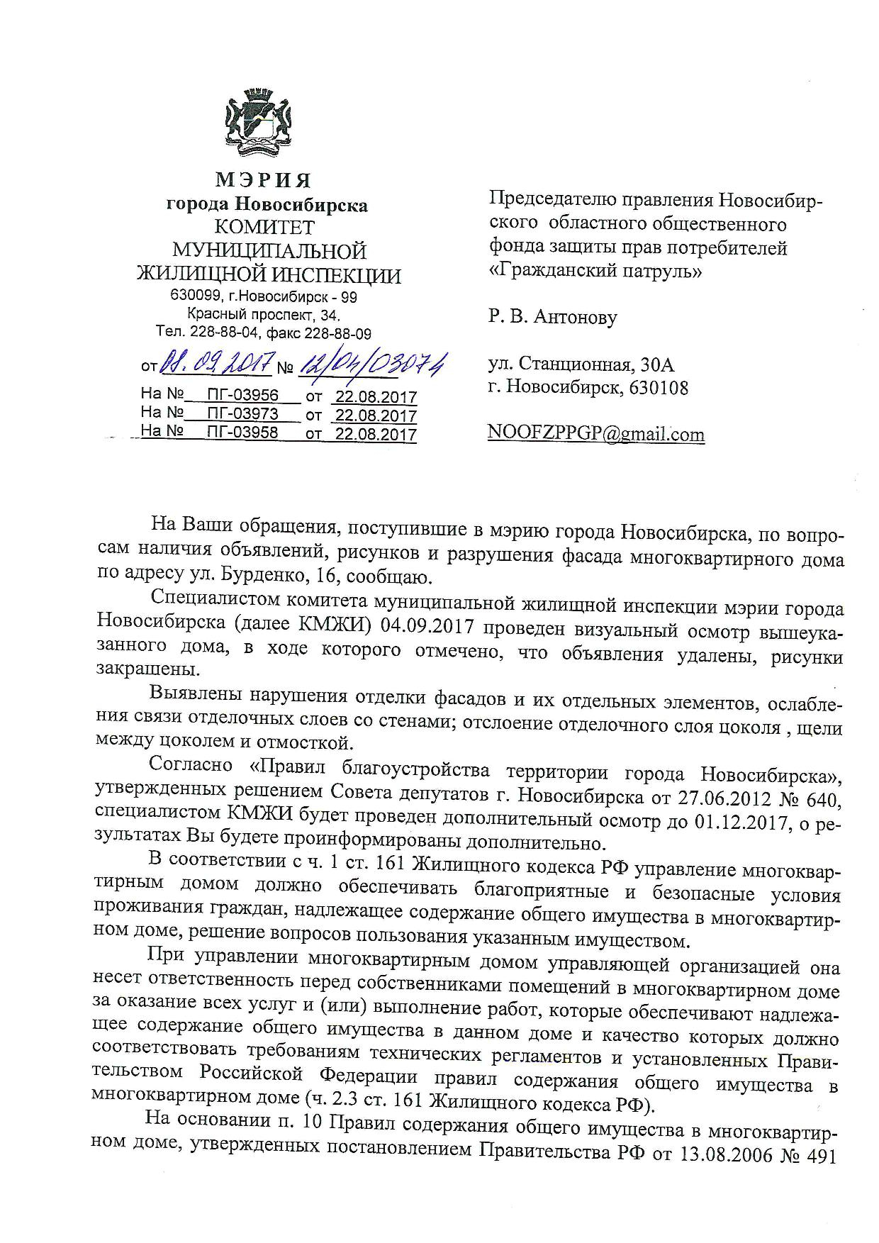 Номер жалобы:23315 Тип жалобы:Иные проблемы ЖКХ Название объекта:Управляющая Компания Город:Новосибирск Адрес:Новосибирск, улица Бурденко, 16 Описание жалобы:Фасад дома разрисован Статус: