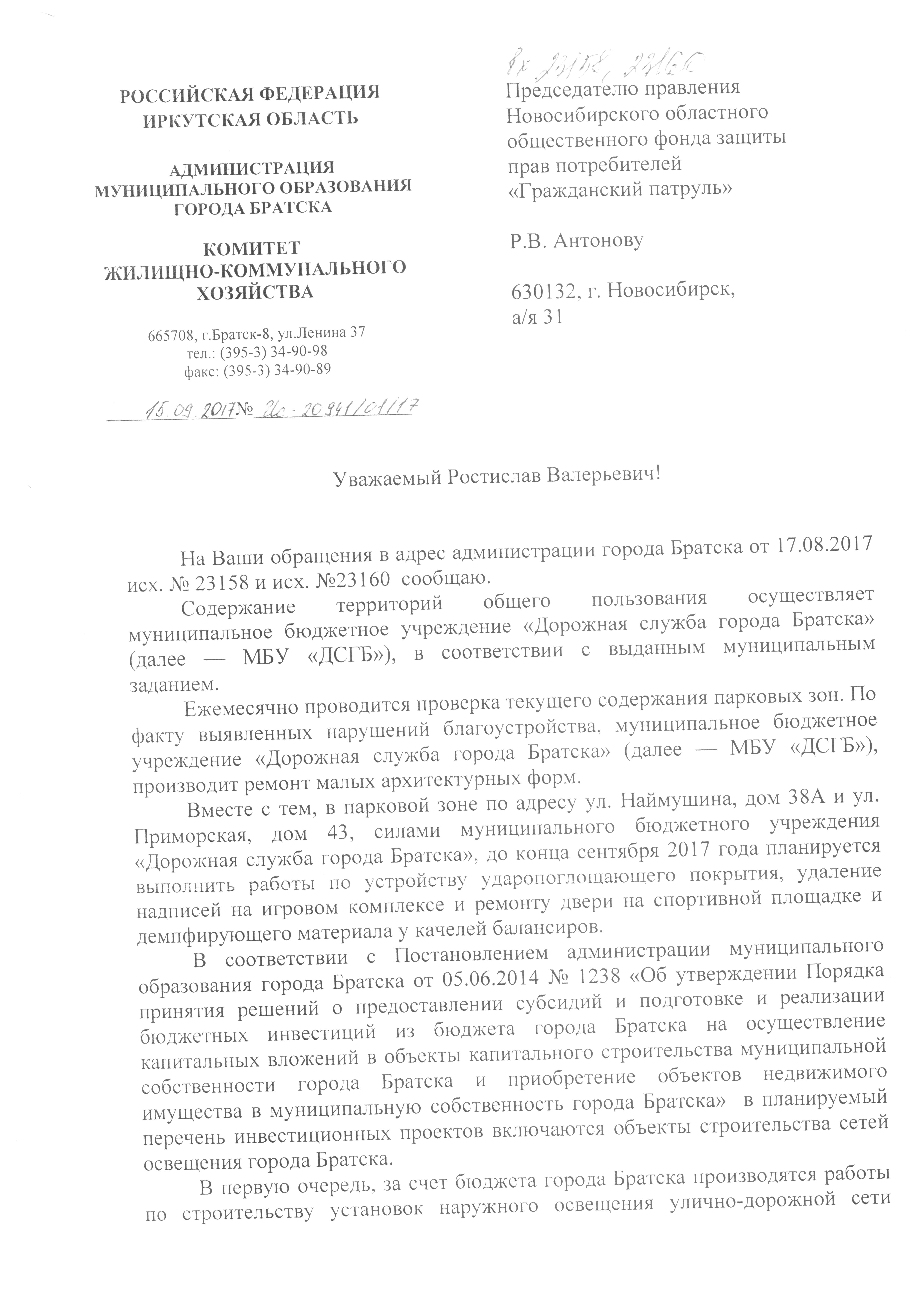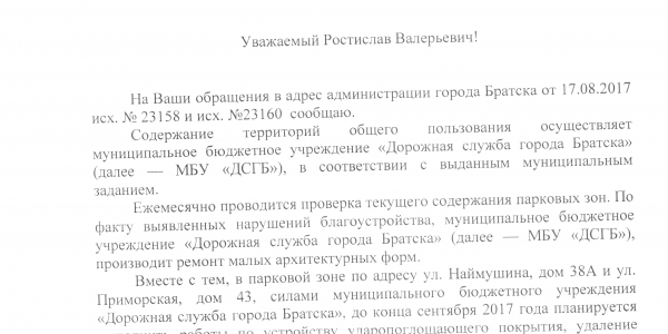 Номер жалобы:23158 Тип жалобы:Иные проблемы ЖКХ Название объекта:Администрация города Братска Регион:Иркутская область Город:Братск Адрес:улица Наймушина, 38А Описание жалобы:На детской площадке (качели, карусель, игровой комплекс, качели-балансиры) не выполнены работы по устройству ударопоглощающего покрытия в соответствии с ГОСТ Р 52169-2012. , игровой комплекс не окрашен и в надписях. Площадка не имеет освещения СанПиН 2.1.2.2645-10. У качелей-балансиров не исправны демпфирующий материал Статус: