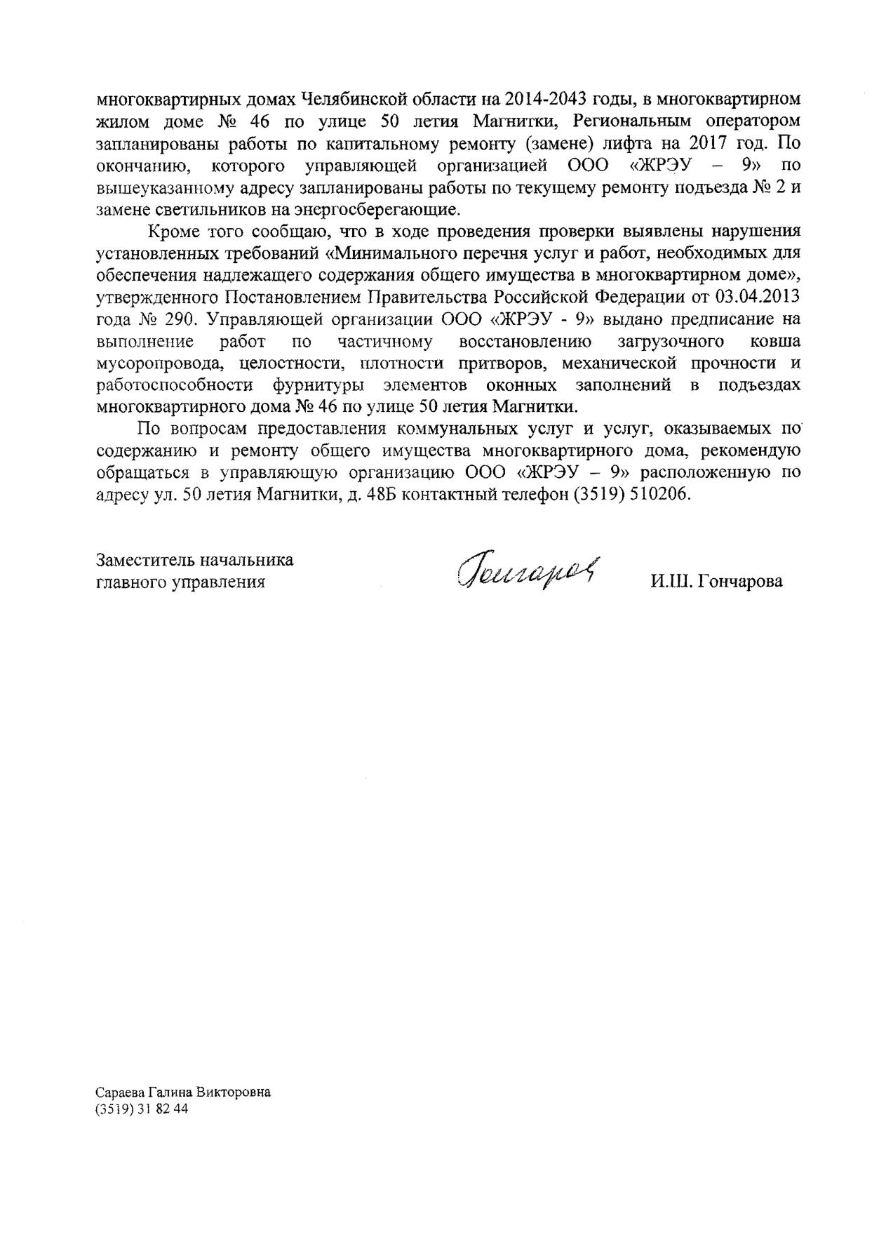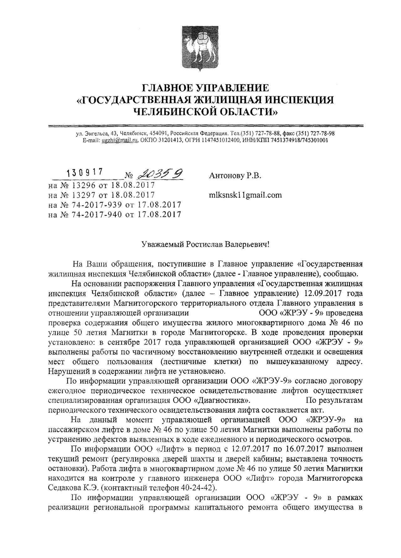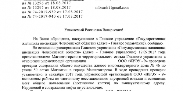 Номер жалобы:23212 Тип жалобы:Иные проблемы ЖКХ Название объекта:Жилищный фонд ООО «ЖРЭУ-9» Регион:Челябинская область Город:Магнитогорск Адрес:ул. 50-летия Магнитки, 46 Описание жалобы:Не проводят ремонт в подъезде более 7 лет, лифт останавливается на 10 см. ниже либо выше, постоянно ломается, срок службы лифта истек пять лет назад, на вопрос когда будет замена лифта и ремонт в подъезде, ответили «этим летом», а лето заканчивается(