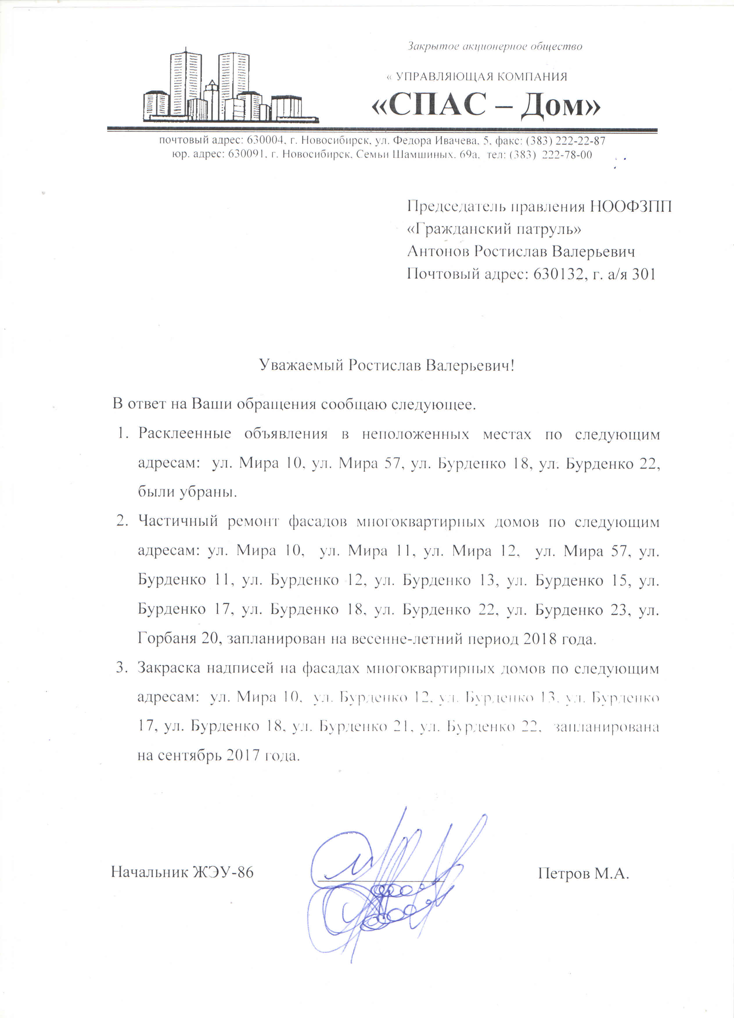 Номер жалобы:23142 Тип жалобы:Иные проблемы ЖКХ Название объекта:Управляющая Компания Город:Новосибирск Адрес:Новосибирск, улица Мира, 10 Описание жалобы:Отваливающаяся штукатурка, фасад дома разрисован Статус: