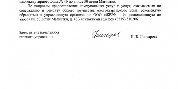 Номер жалобы:23211 Тип жалобы:Иные проблемы ЖКХ Название объекта:Жилищный фонд ООО «ЖРЭУ-9» Регион:Челябинская область Город:Магнитогорск Адрес:ул. 50-летия Магнитки, 46 Описание жалобы:Нет освещения на лестничной площадке, постоянно вкручиваем свои лампочки! Статус: