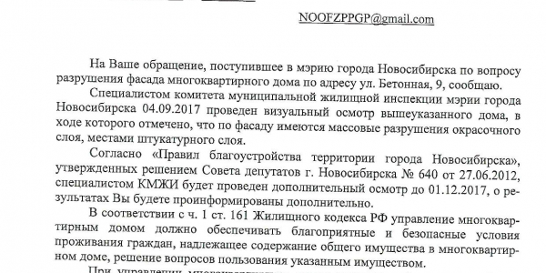 Номер жалобы:23120 Тип жалобы:Иные проблемы ЖКХ Название объекта:Управляющая Компания Город:Новосибирск Адрес:Новосибирск, Бетонная улица, 11 Описание жалобы:Фасад разрушен Статус: