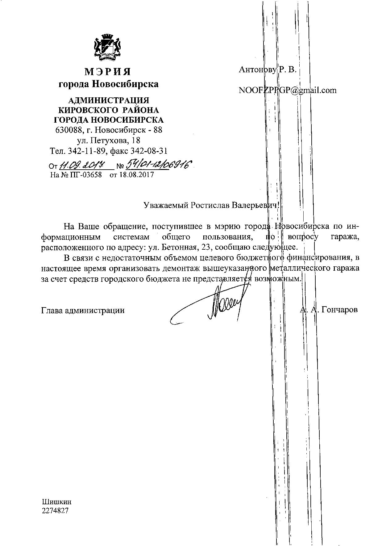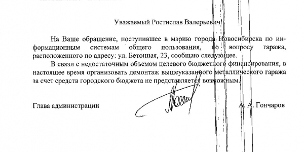 Номер жалобы:23108 Тип жалобы:Иные проблемы ЖКХ Название объекта:Управляющая Компания Город:Новосибирск Адрес:Новосибирск, Бетонная улица, 23 Описание жалобы:Гараж напротив дома Статус: