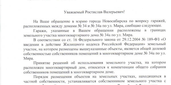 Номер жалобы:23112 Тип жалобы:Иные проблемы ЖКХ Название объекта:Управляющая Компания Город:Новосибирск Адрес:Новосибирск, улица Мира, 34 Описание жалобы:гаради между домами 34 и 34а Статус: