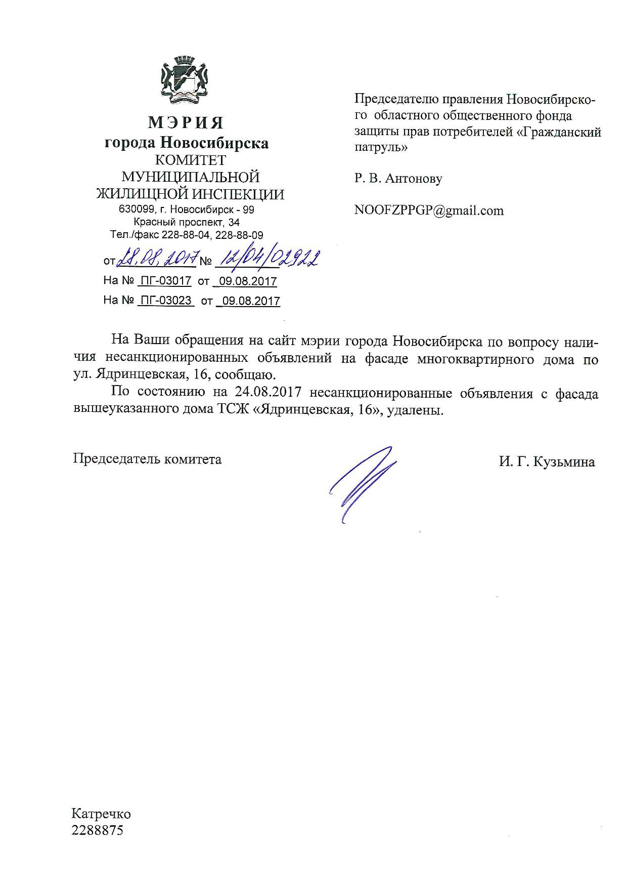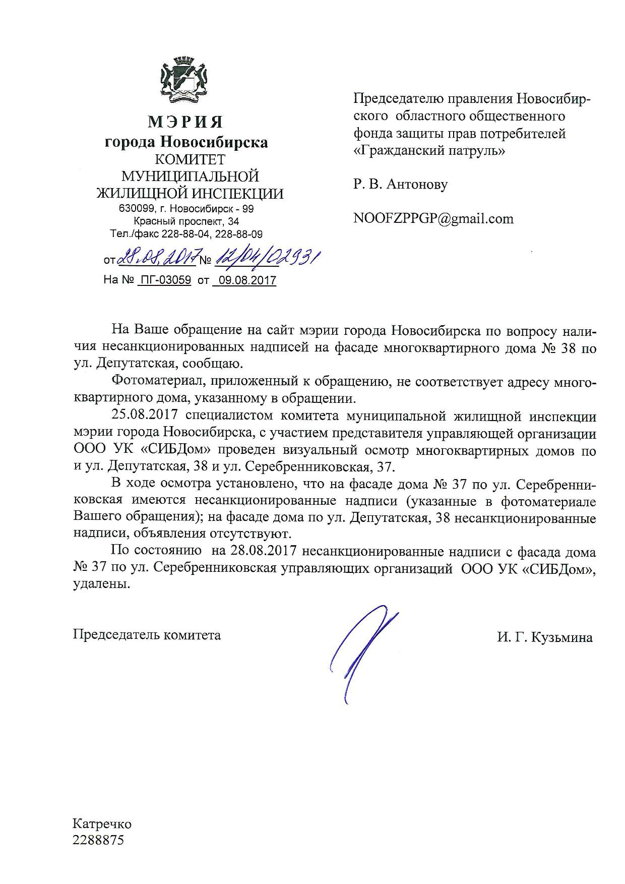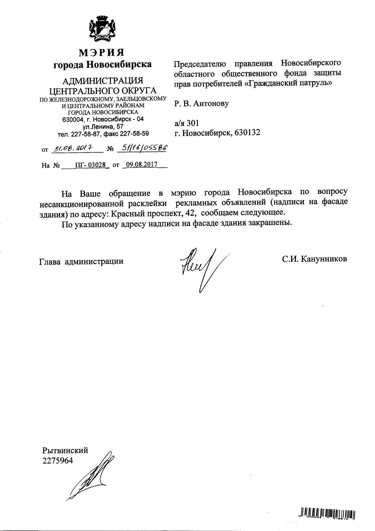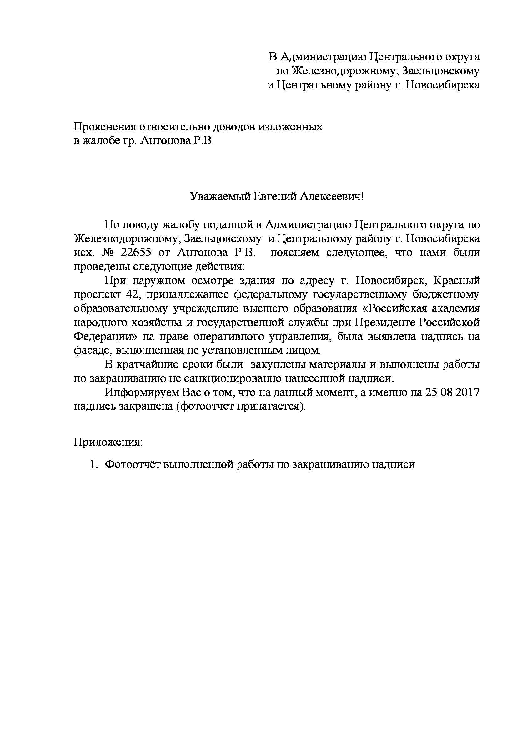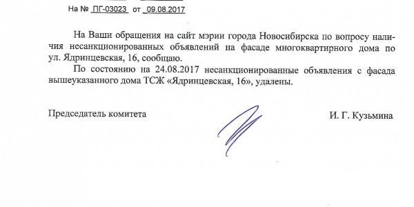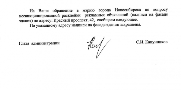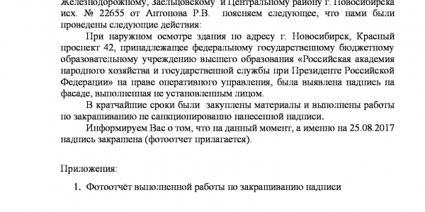 Номер жалобы:22655 Тип жалобы:Иные проблемы ЖКХ Название объекта:Управляющая Компания Регион:Новосибирская область Город:Новосибирск Адрес:Красный пр., 42 Описание жалобы:Надписи на фасаде Статус: