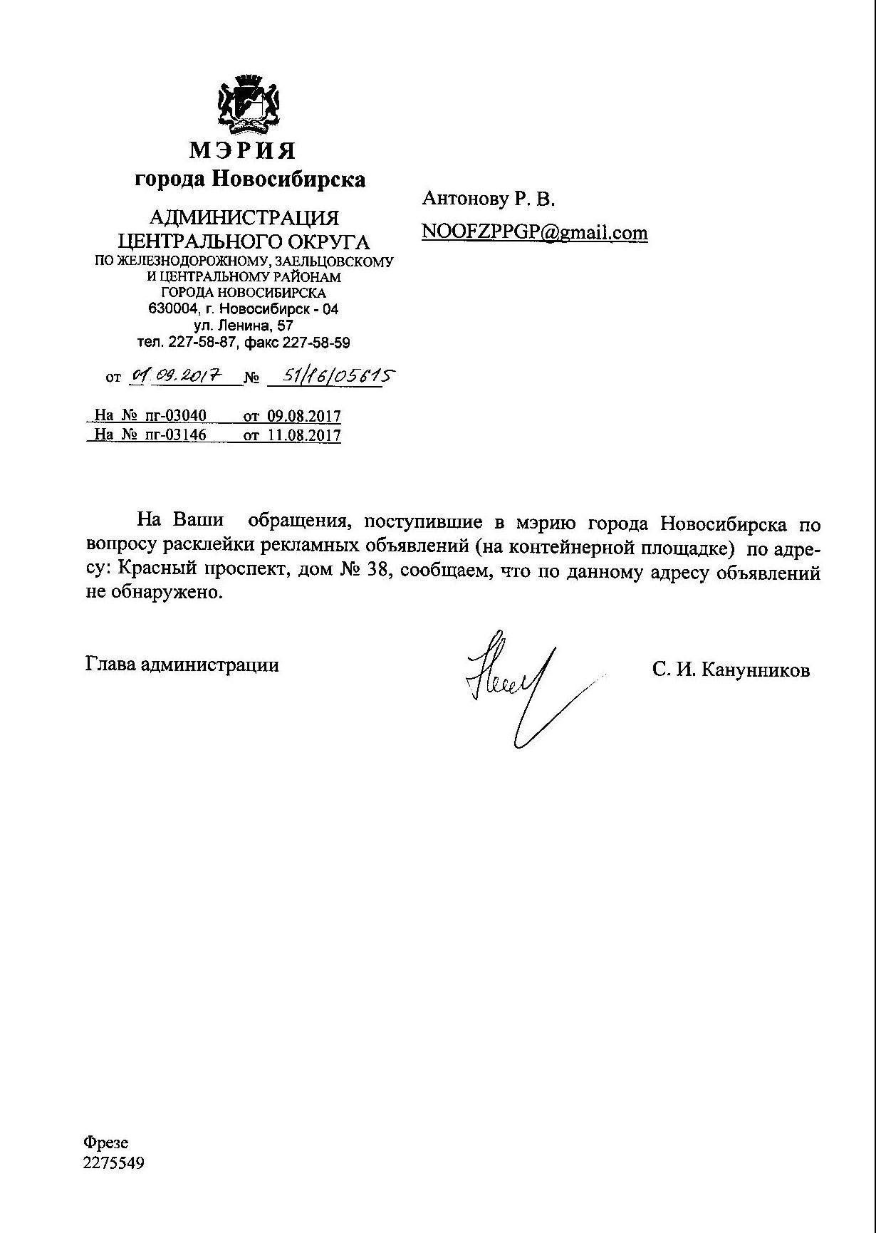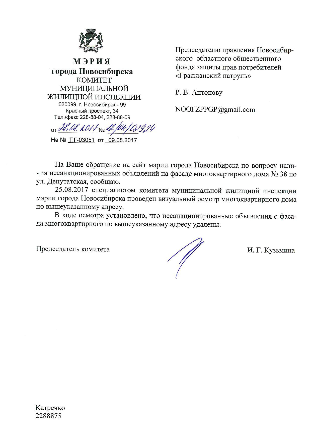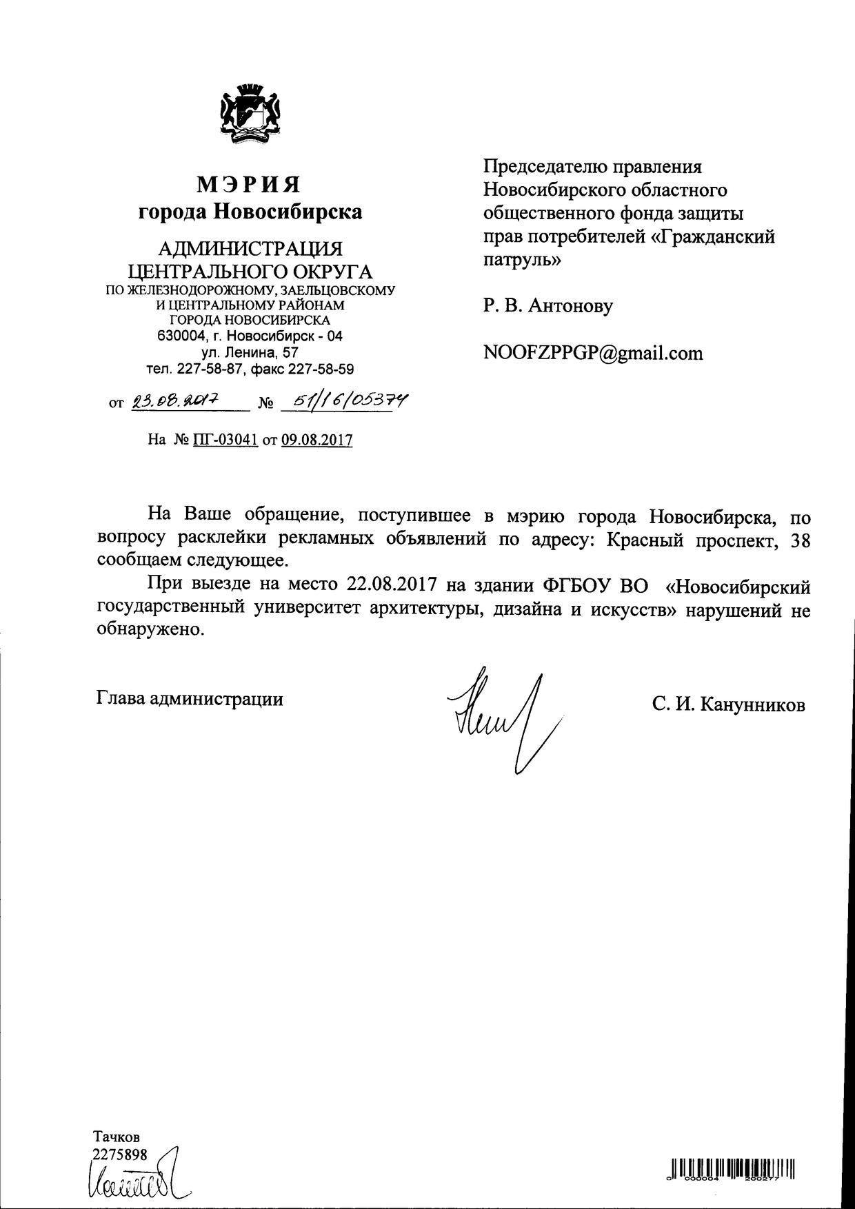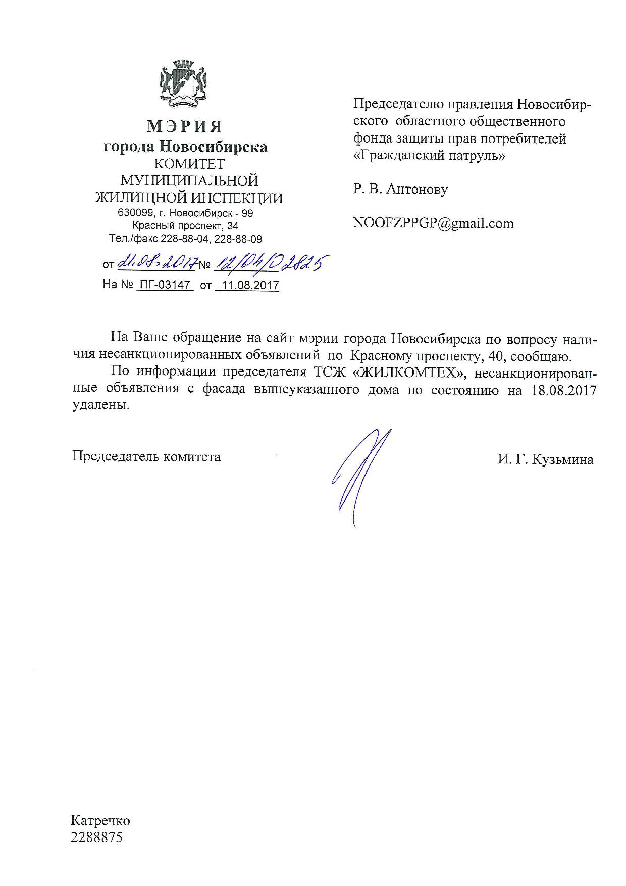 Номер жалобы:22655 Тип жалобы:Иные проблемы ЖКХ Название объекта:Управляющая Компания Регион:Новосибирская область Город:Новосибирск Адрес:Красный пр., 42 Описание жалобы:Надписи на фасаде Статус: