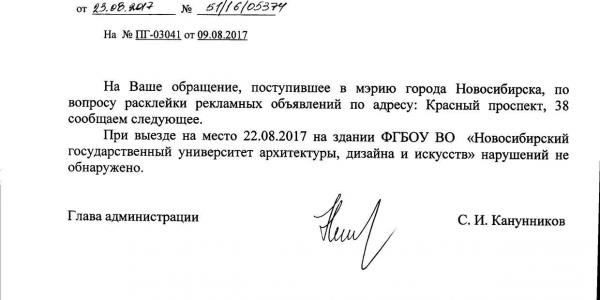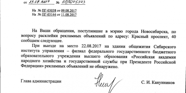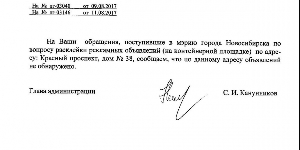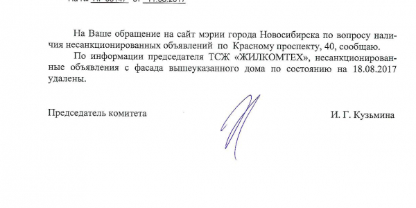 Номер жалобы:22660 Тип жалобы:Иные проблемы ЖКХ Название объекта:Управляющая Компания Регион:Новосибирская область Город:Новосибирск Адрес:Красный пр., 38 Описание жалобы:Объявления в неположенном месте Статус: