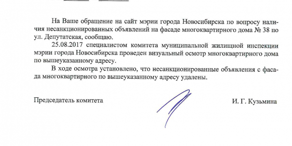 Номер жалобы:22664 Тип жалобы:Иные проблемы ЖКХ Название объекта:Управляющая Компания Регион:Новосибирская область Город:Новосибирск Адрес:Депутатская ул., 38 Описание жалобы:Объявления на фасаде Статус: