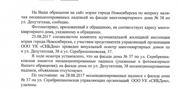 Номер жалобы:22665 Тип жалобы:Иные проблемы ЖКХ Название объекта:Управляющая Компания Регион:Новосибирская область Город:Новосибирск Адрес:Депутатская ул., 38 Описание жалобы:Надписи на фасаде Статус: