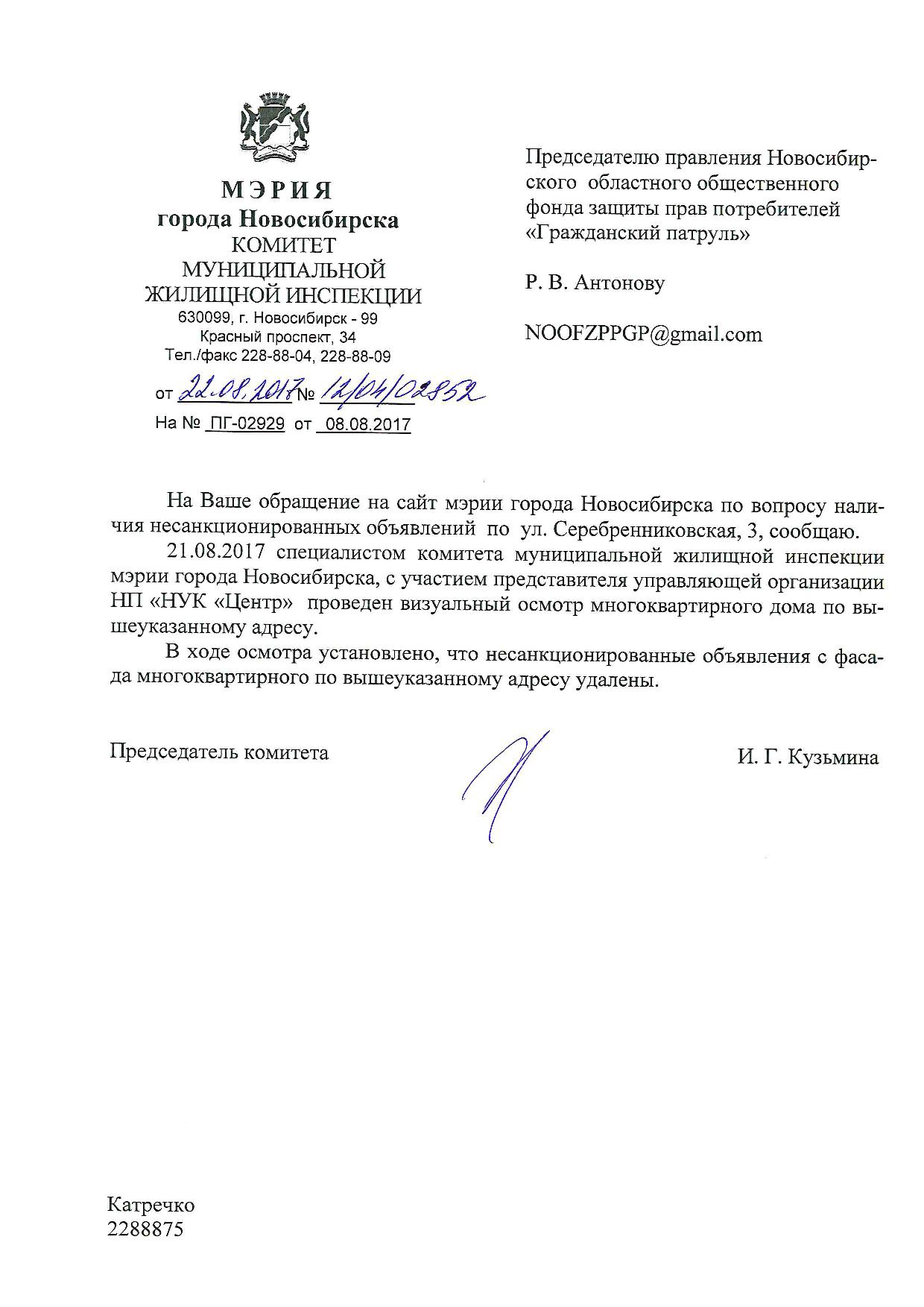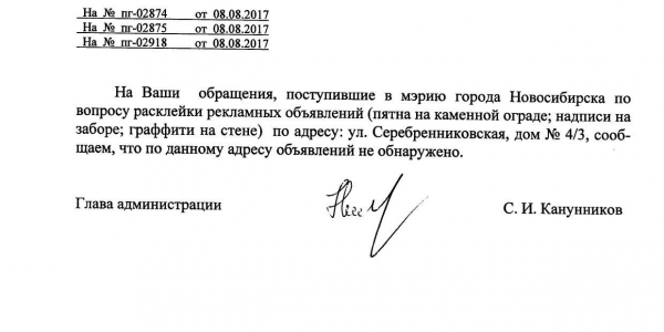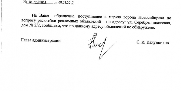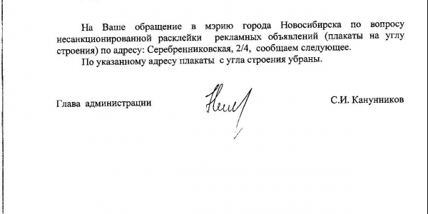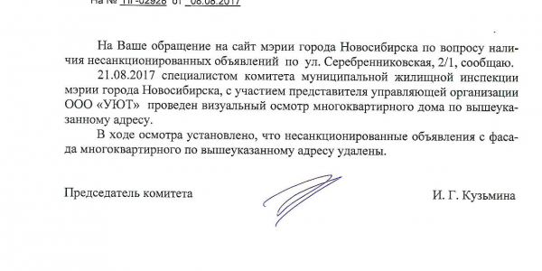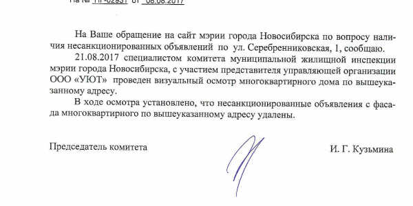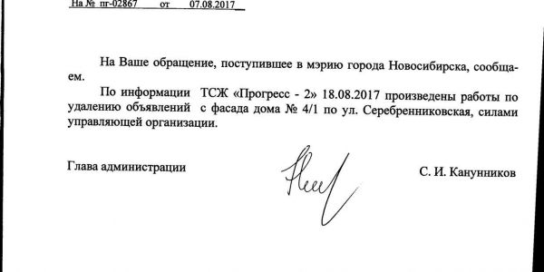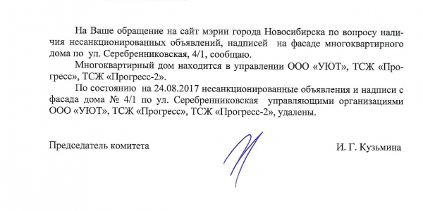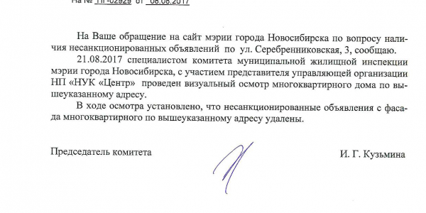 Номер жалобы:22578 Тип жалобы:Иные проблемы ЖКХ Название объекта:Управляющая Компания Регион:Новосибирская область Город:Новосибирск Адрес:Серебренниковская ул., 4/3 Описание жалобы:Объявление на фасаде Статус: