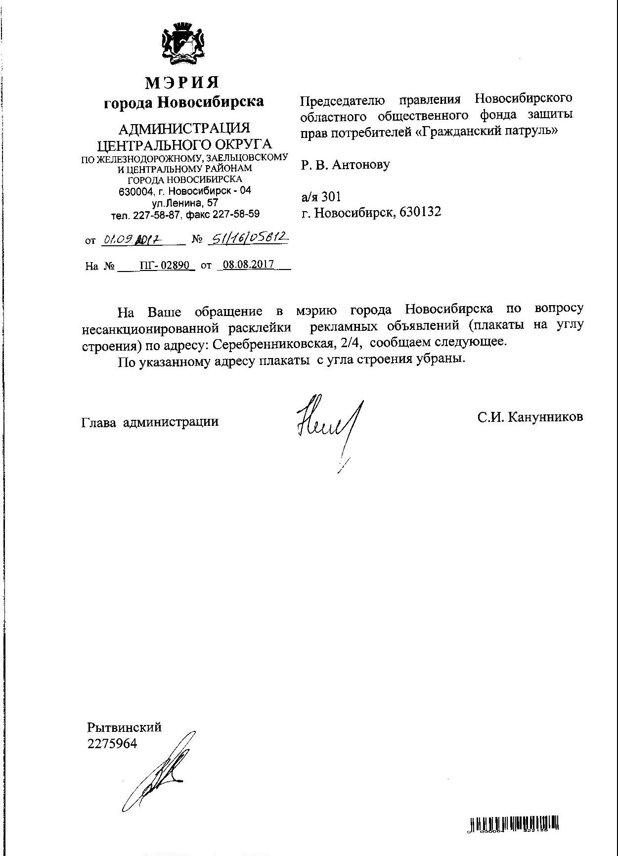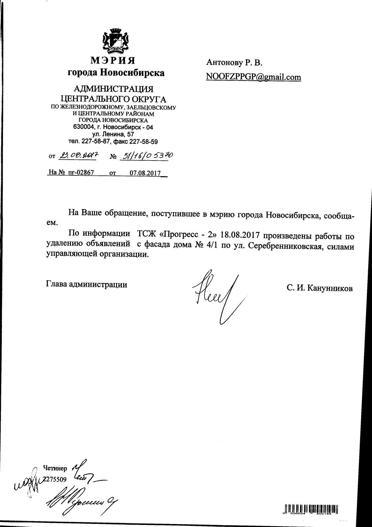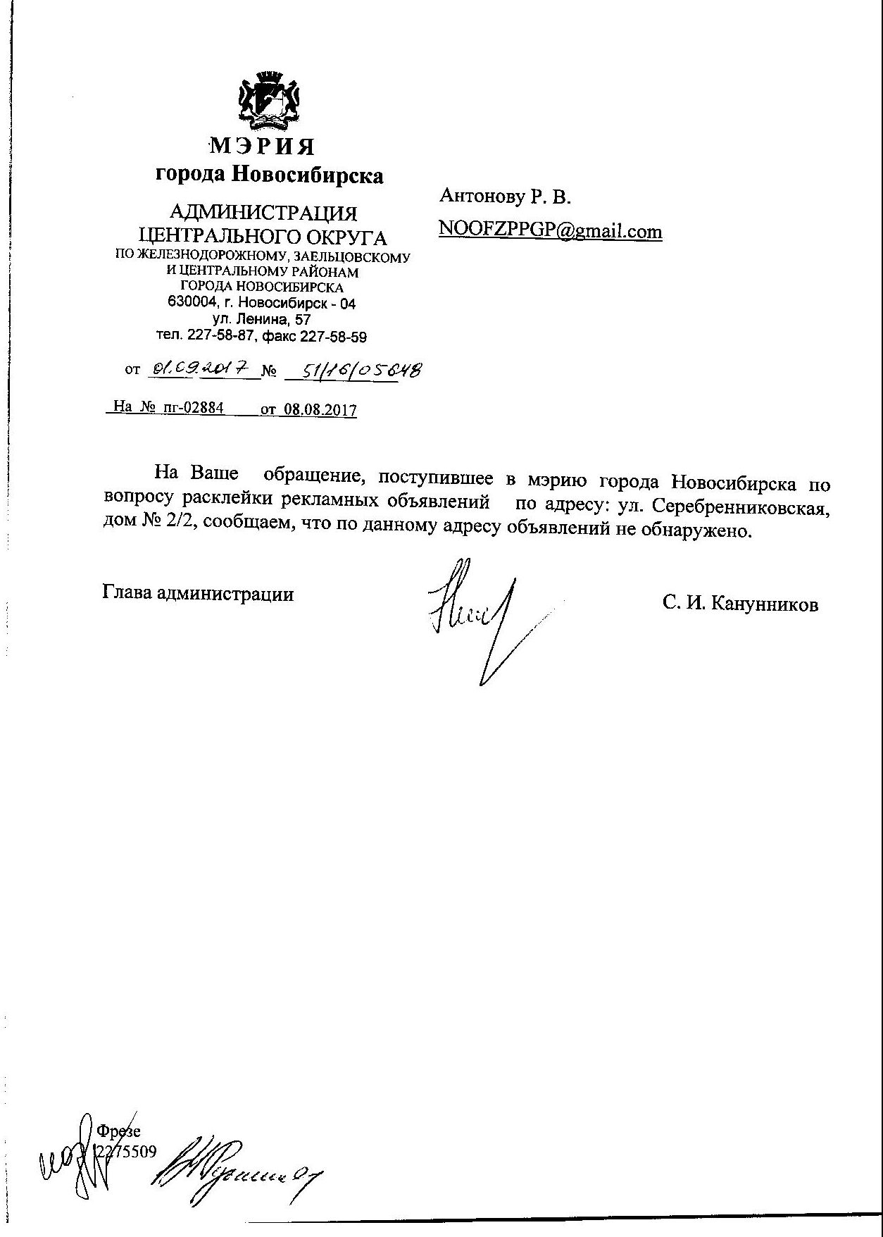 Номер жалобы:22578 Тип жалобы:Иные проблемы ЖКХ Название объекта:Управляющая Компания Регион:Новосибирская область Город:Новосибирск Адрес:Серебренниковская ул., 4/3 Описание жалобы:Объявление на фасаде Статус: