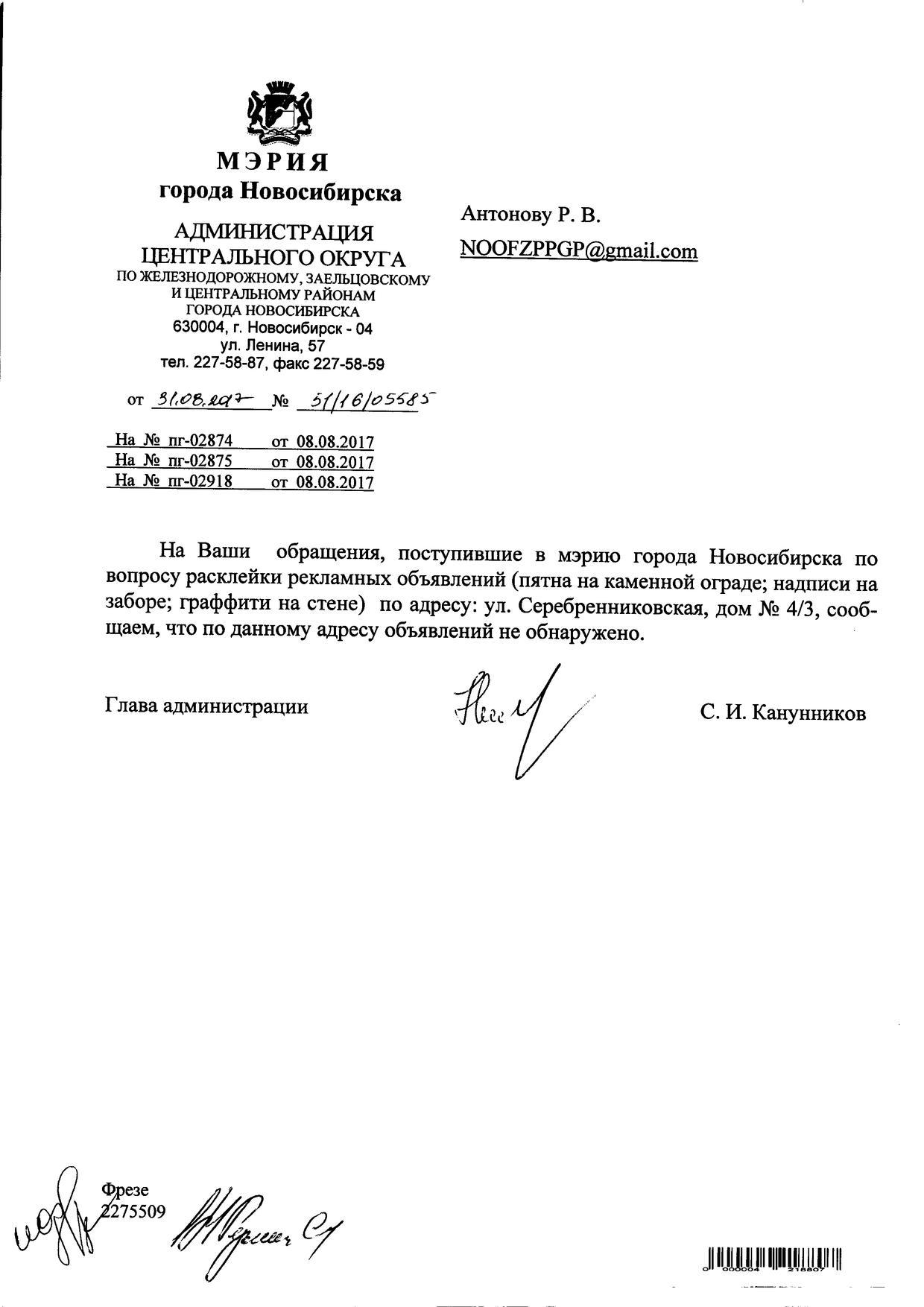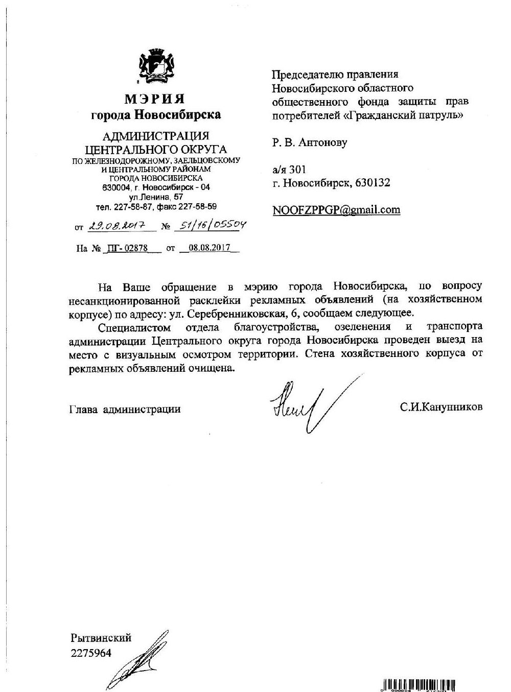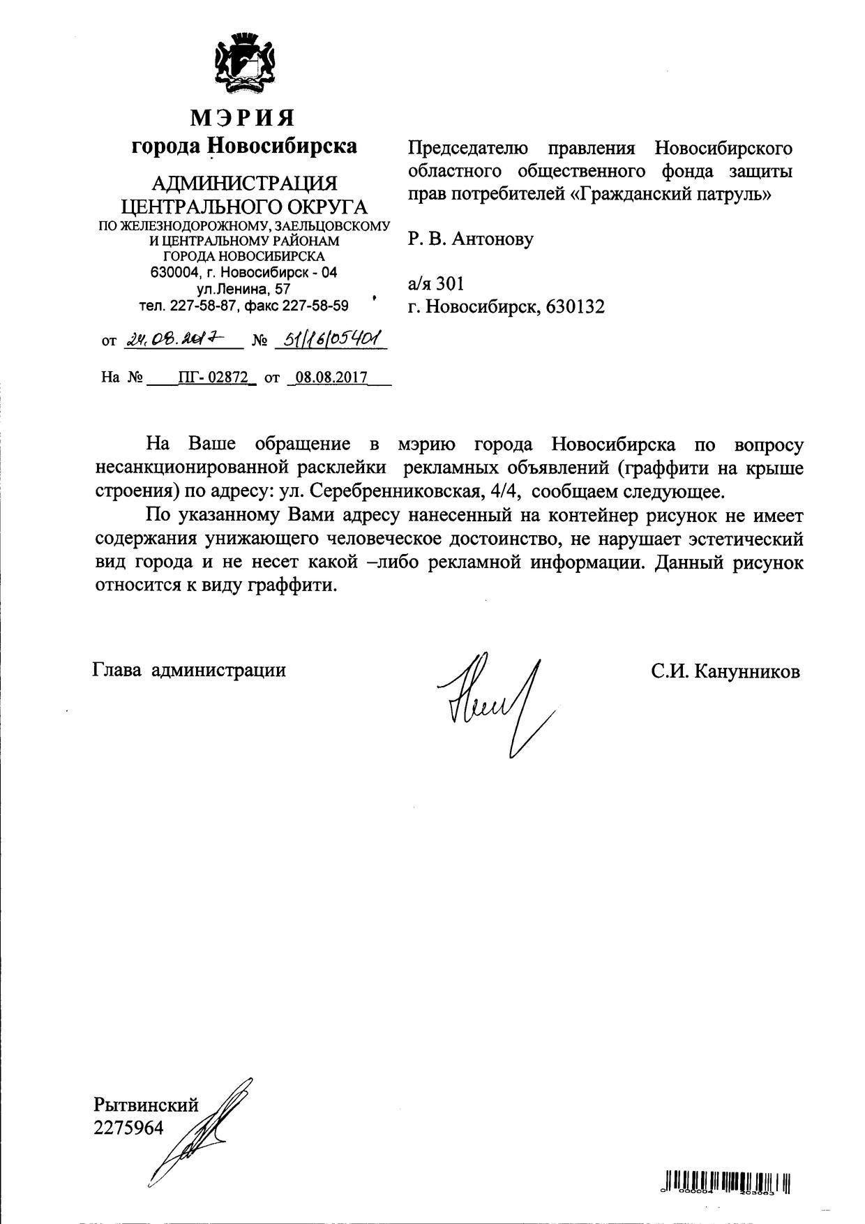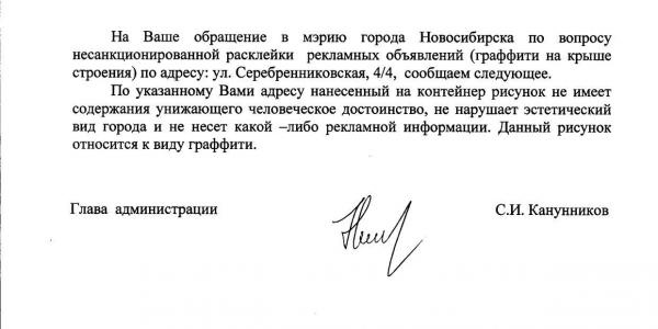 Номер жалобы:22574 Тип жалобы:Иные проблемы ЖКХ Название объекта:Управляющая Компания Регион:Новосибирская область Город:Новосибирск Адрес:Каменская 25а Описание жалобы:Каменская 25а,надписи в неположенном месте Статус:
