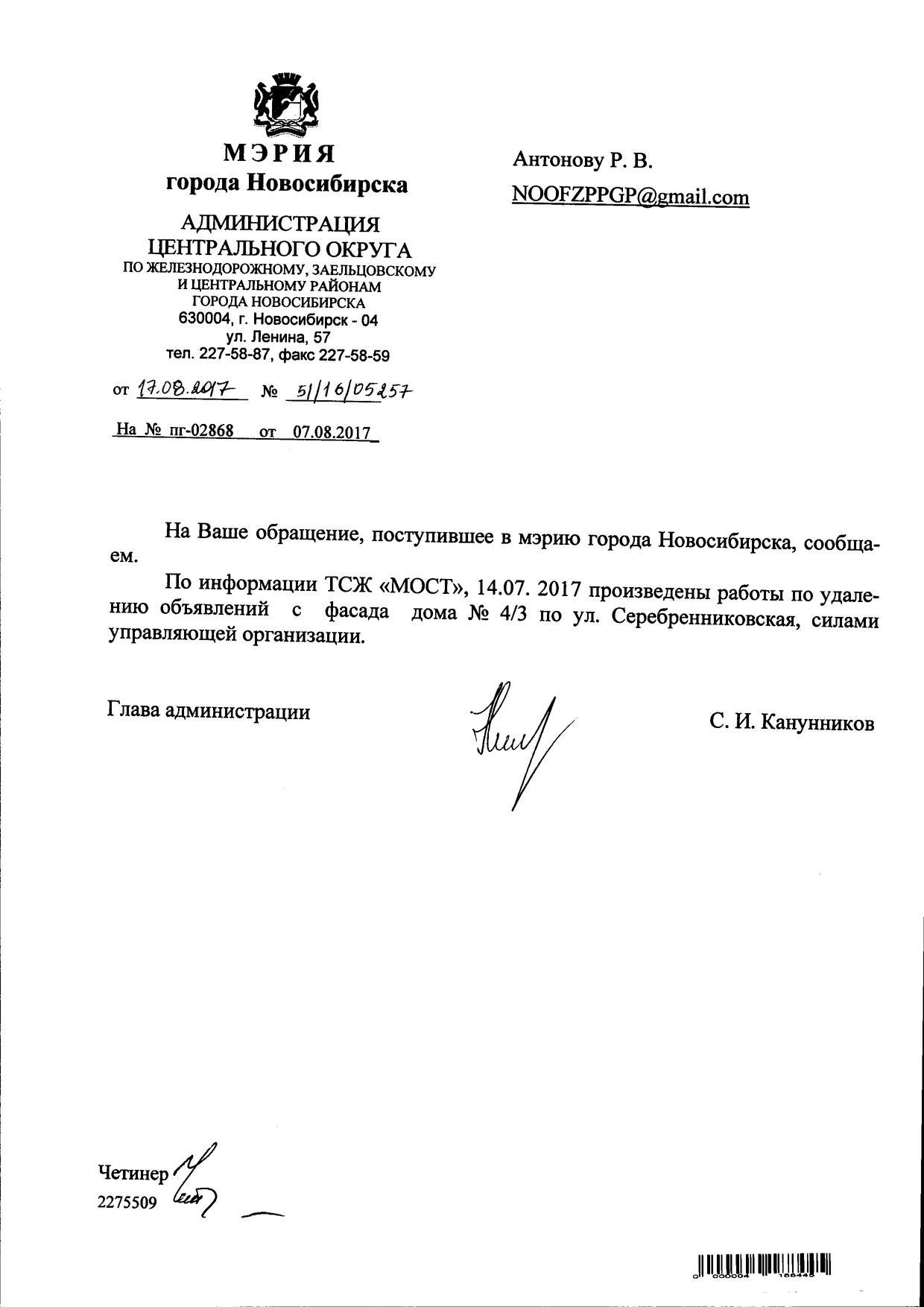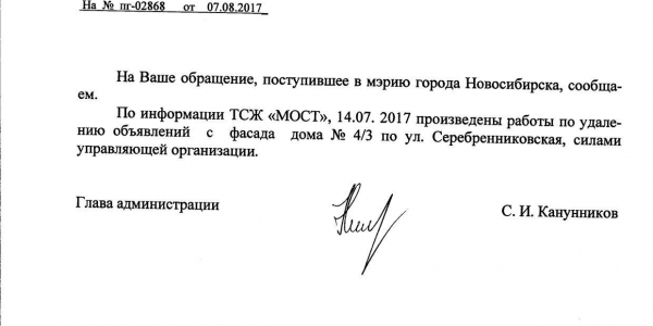 Номер жалобы:22577 Тип жалобы:Иные проблемы ЖКХ Название объекта:Управляющая Компания Регион:Новосибирская область Город:Новосибирск Адрес:Серебренниковская ул., 4/2 Описание жалобы:Объявления на фасаде дома Статус: