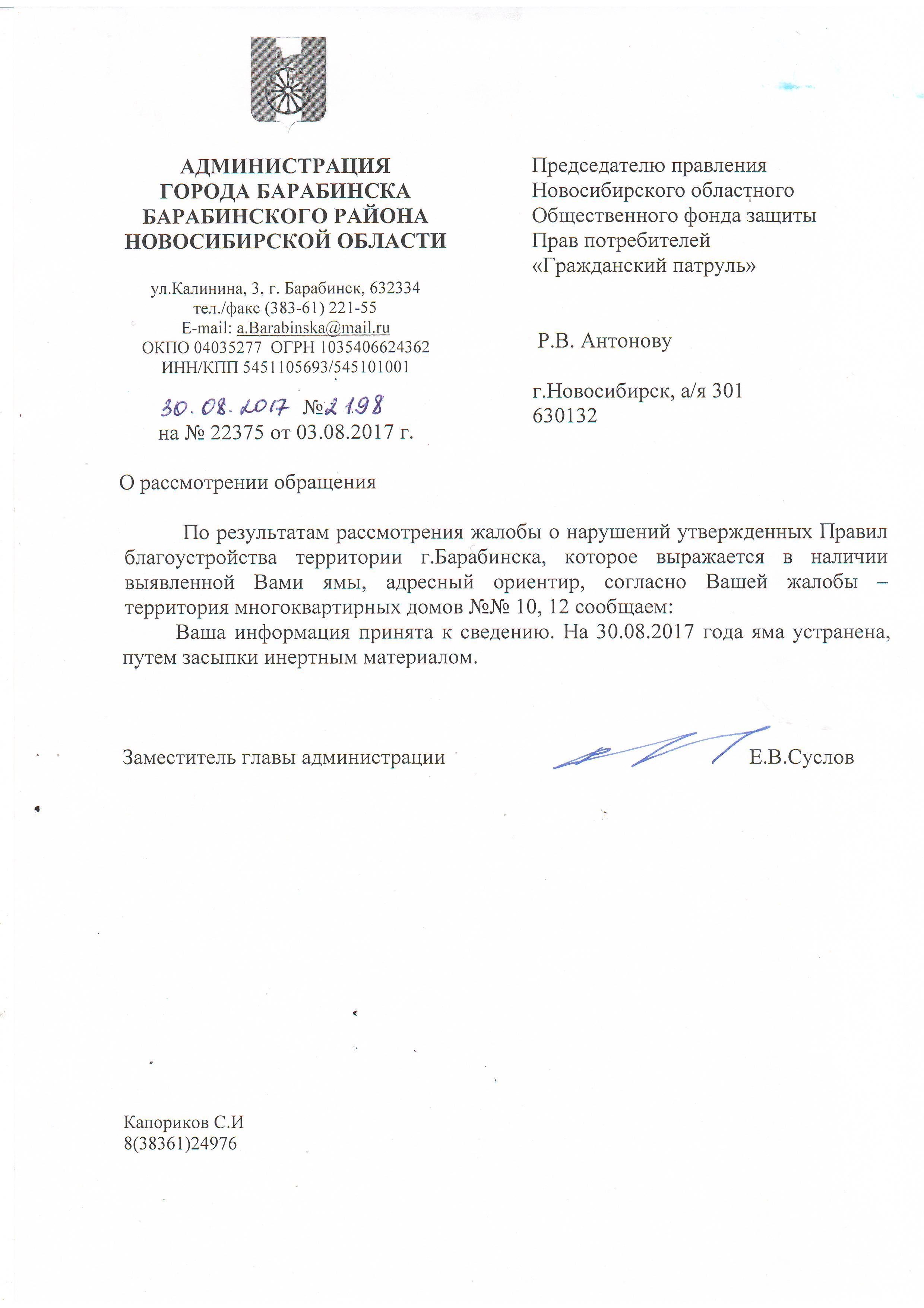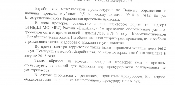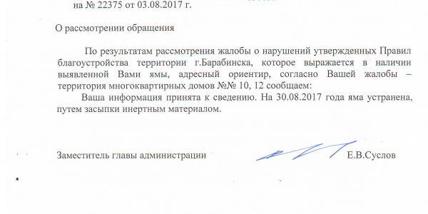 Номер жалобы:22375 Тип жалобы:Иные проблемы ЖКХ Название объекта:Муп ЖКХ Регион:Новосибирская область Город:Барабинск Адрес:Коммунистическая ул., 12 Описание жалобы:Яма между 10 и 12 домом во дворе, глубина более 50 см. Власти на обращения не реагируют. Яме уже 15 ЛЕТ! 89831275106 Ольга Александровна Панова Статус: