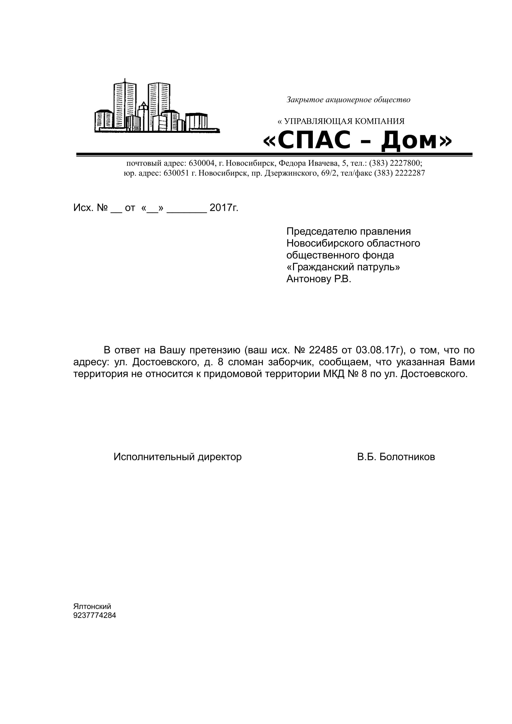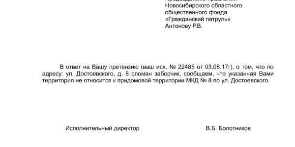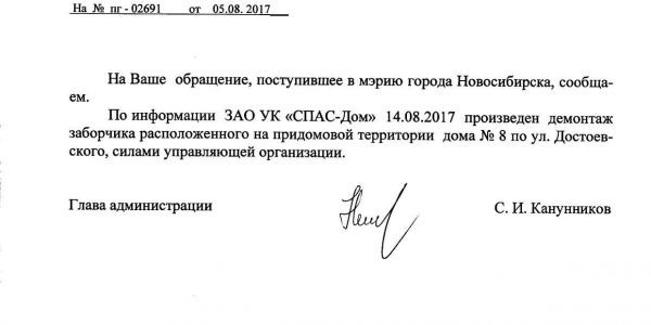 Номер жалобы:22485 Тип жалобы:Иные проблемы ЖКХ Название объекта:Управляющая Компания Регион:Новосибирская область Город:Новосибирск Адрес:ул. Достоевского, 8 Описание жалобы:За домом сломан заборчик Статус: