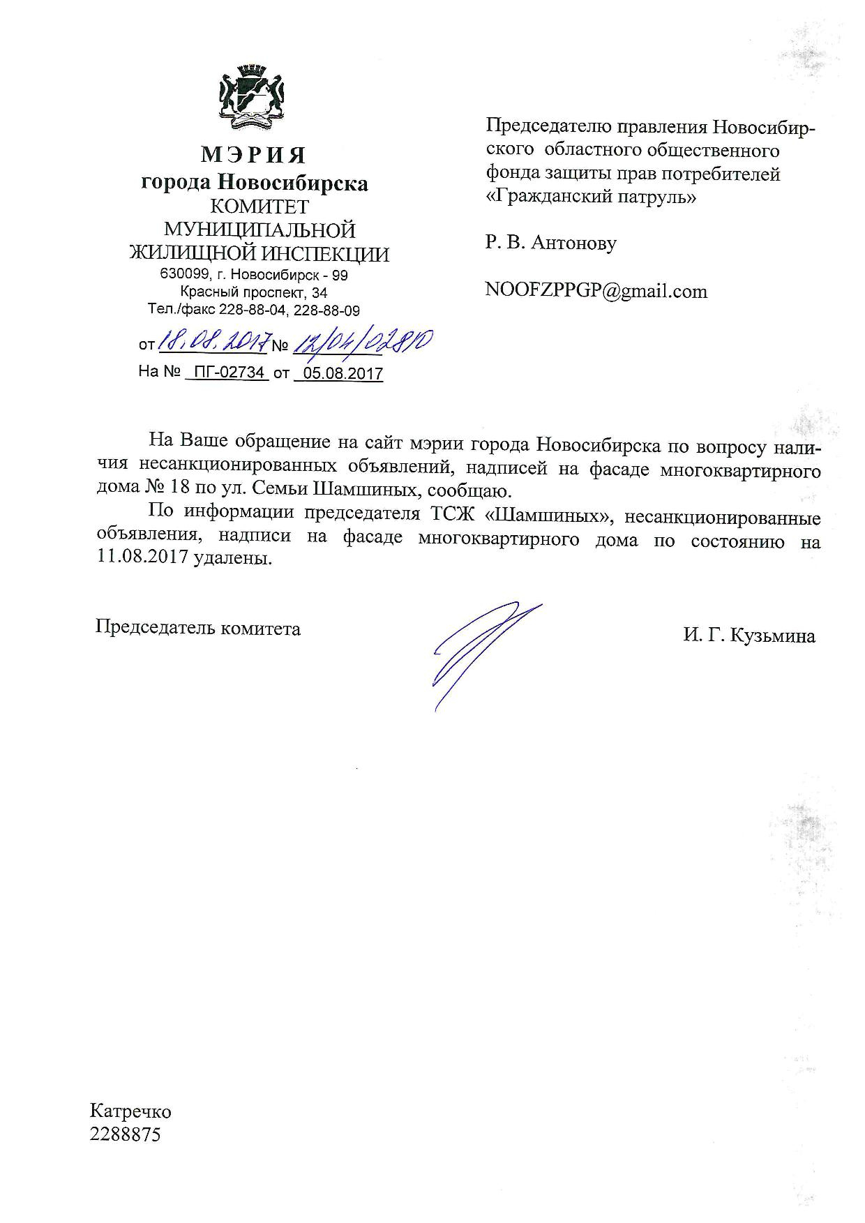 Номер жалобы:22486 Тип жалобы:Иные проблемы ЖКХ Название объекта:Управляющая Компания Регион:Новосибирская область Город:Новосибирск Адрес:Красный пр., 73 Описание жалобы:Надписи на фасаде дома Статус: