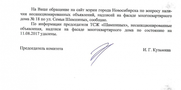 Номер жалобы:22497 Тип жалобы:Иные проблемы ЖКХ Название объекта:Управляющая Компания Регион:Новосибирская область Город:Новосибирск Адрес:ул. Семьи Шамшиных, 18 Описание жалобы:Надписи на фасаде дома Статус: