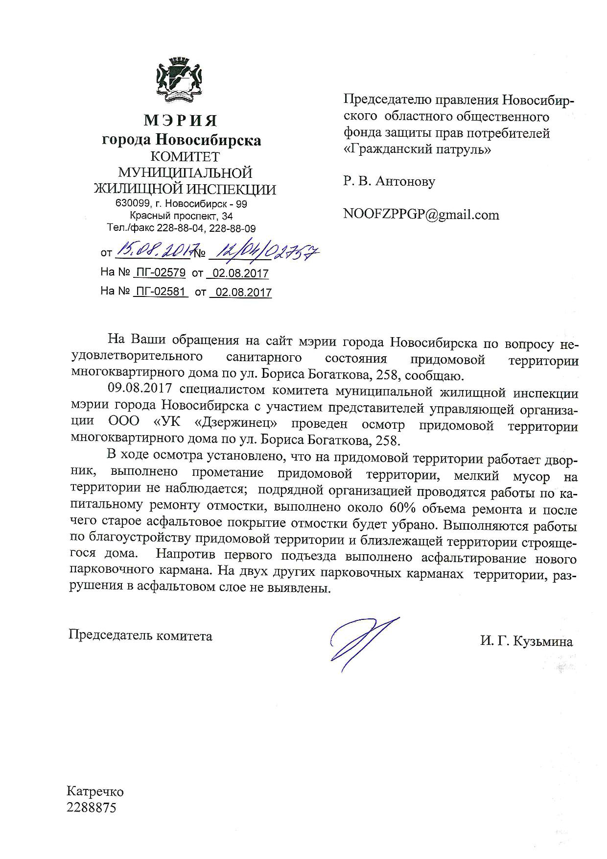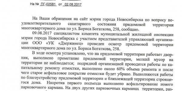 Номер жалобы:22235 Тип жалобы:Иные проблемы ЖКХ Название объекта:Управляющая Компания Город:Новосибирск Адрес:Новосибирск, улица Бориса Богаткова, 262 Описание жалобы:Комментарий Статус: