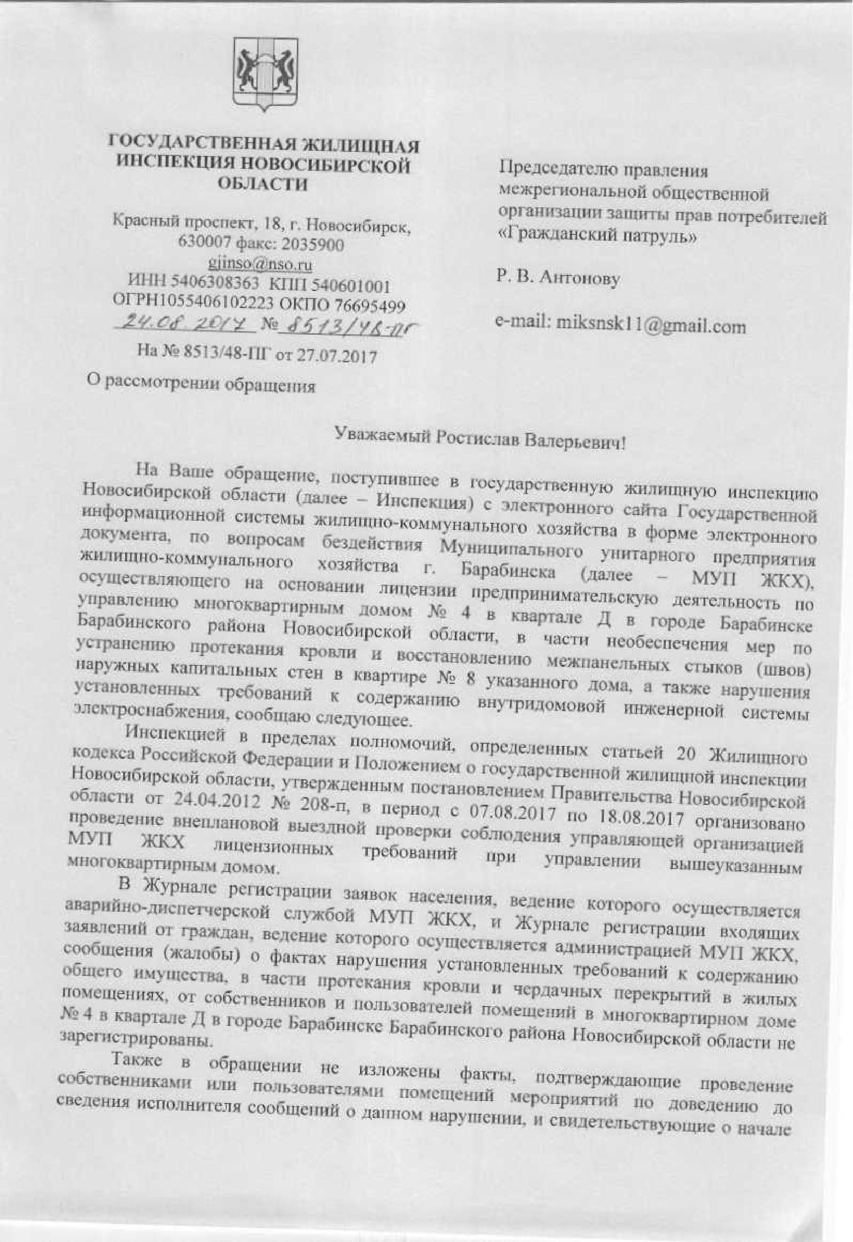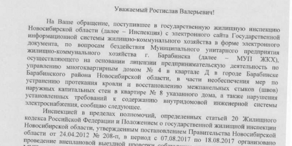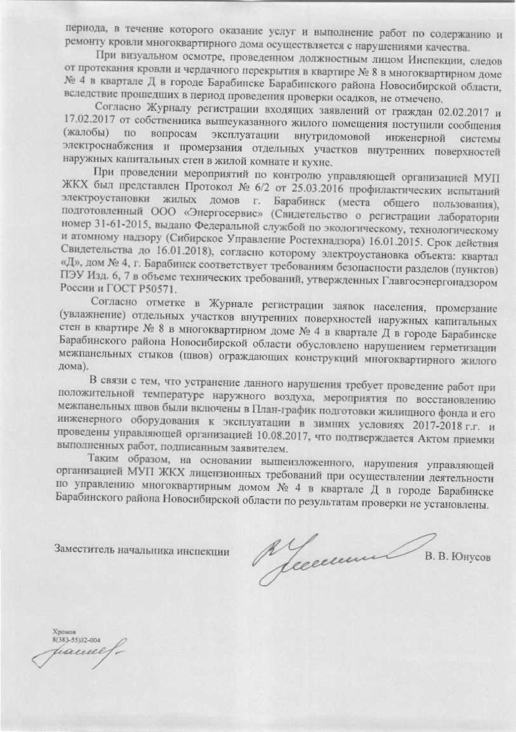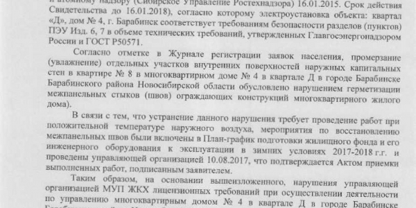 Номер жалобы:22268 Тип жалобы:Иные проблемы ЖКХ Название объекта:Муп Жкх Регион:Новосибирская область Город:Барабинск Адрес:кв-л Д ул., 4 Описание жалобы:Текут потолки в квартире, стены в плесени, на заявление не реагируют с февраля! В подвале открытый электрощит, провода висят. Квартал Д дом 4 квартира 8 тел 89130625279/88137468350 Александр Статус:
