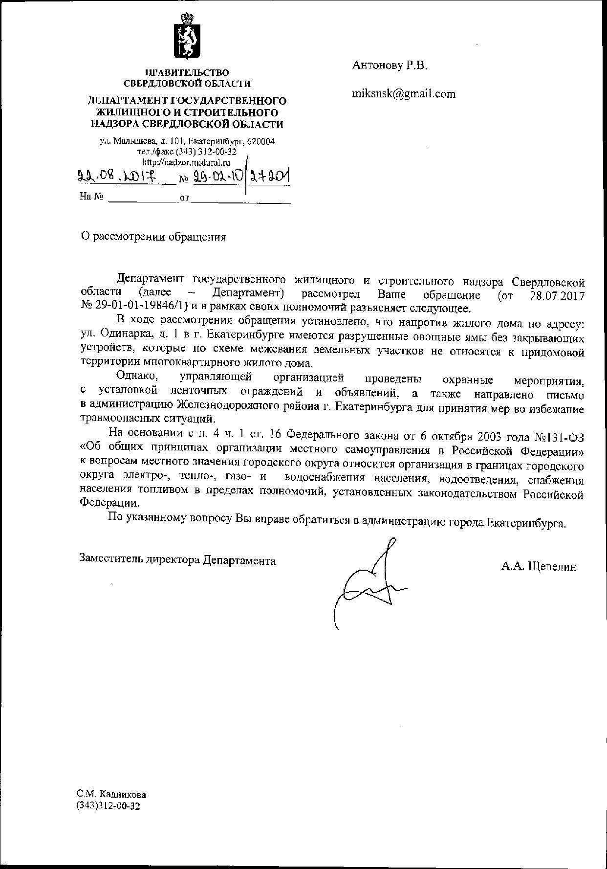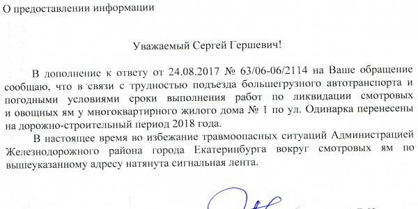 Номер жалобы:22294 Тип жалобы:Иные проблемы ЖКХ Название объекта:РЭМП Регион:Свердловская область Город:Екатеринбург Адрес:ул. Одинарка, 1 Описание жалобы:Ямы напротив дома ОДИНАРКА 1, порядка 7-8 ям. Статус: