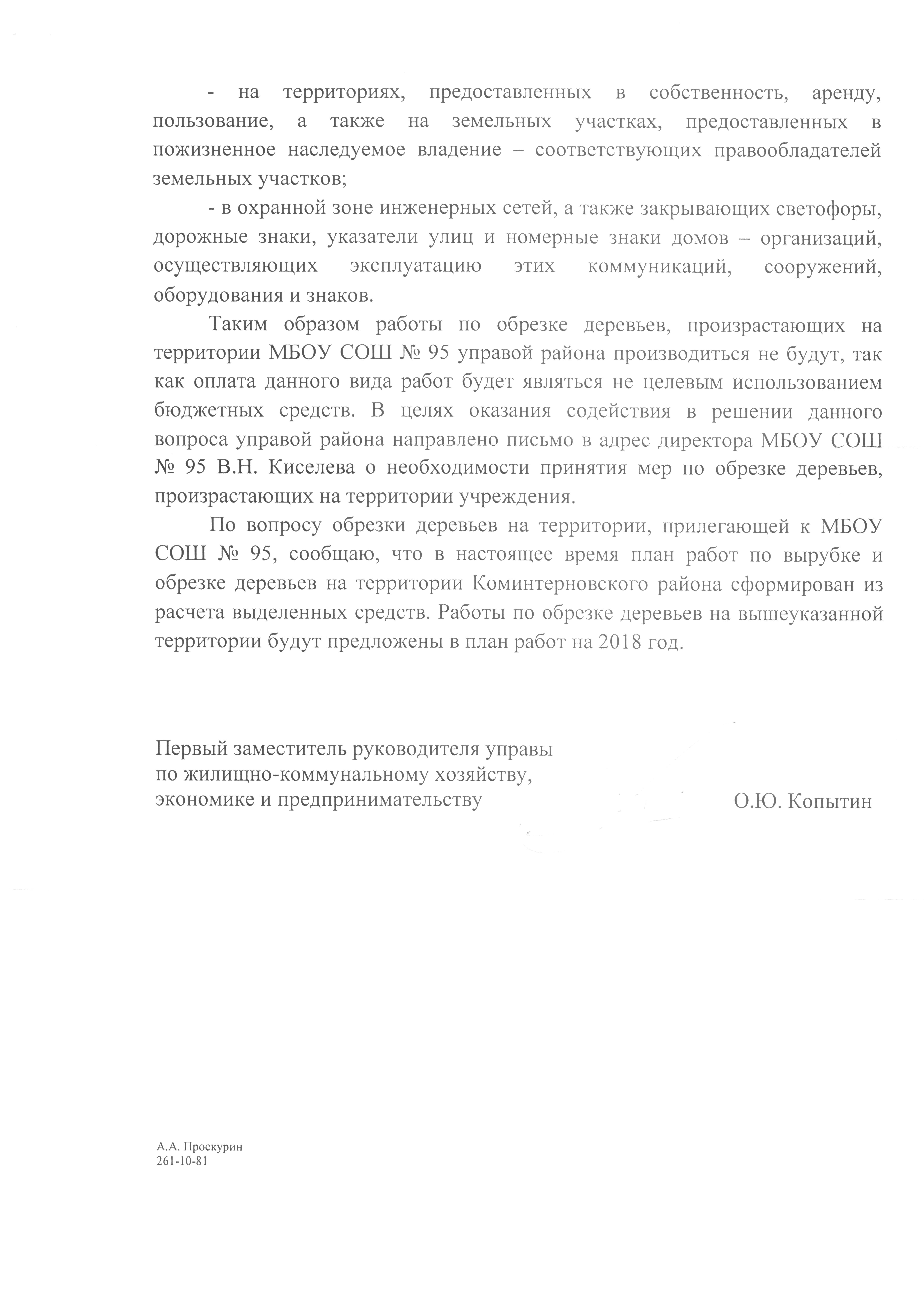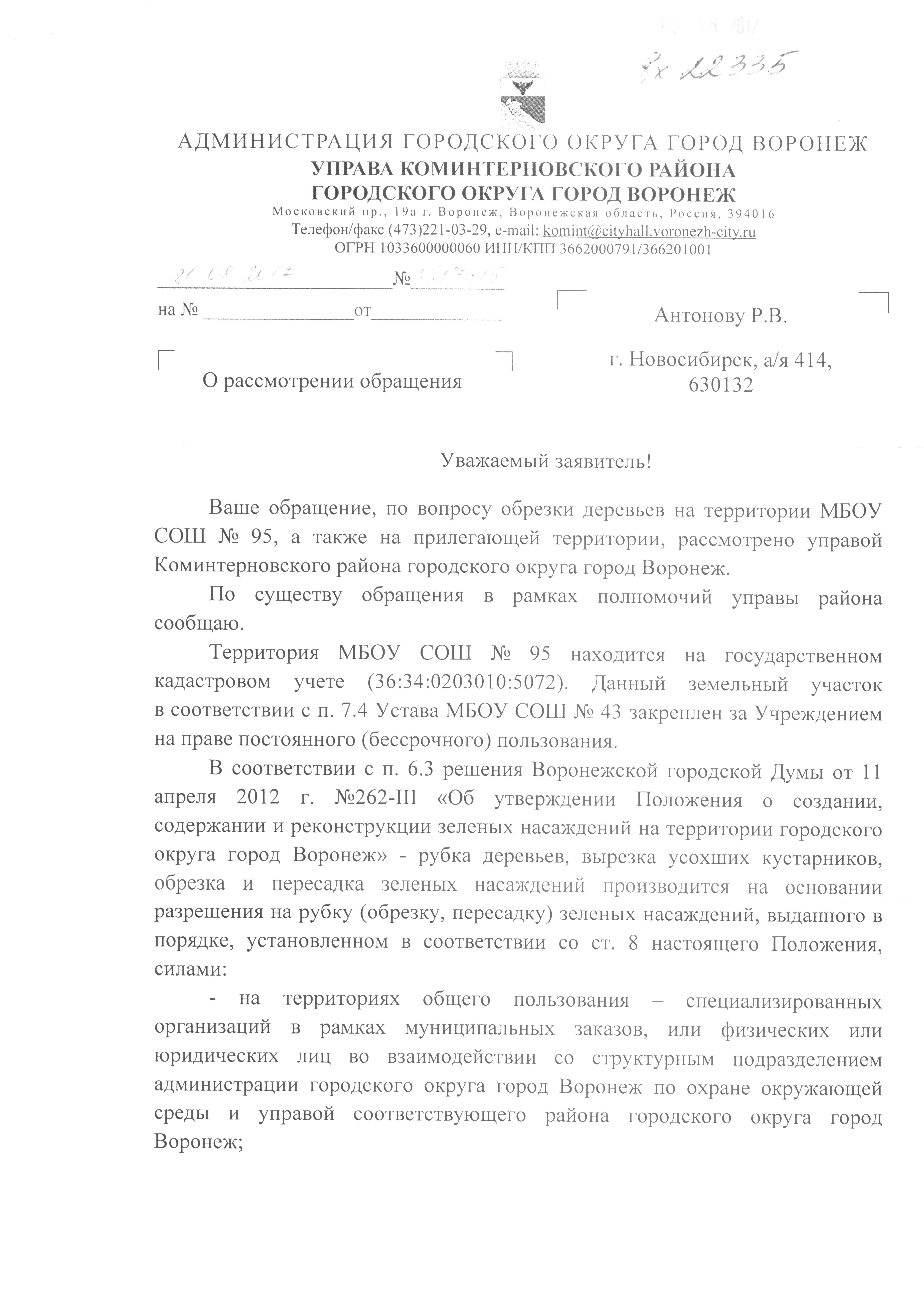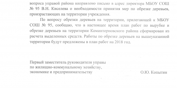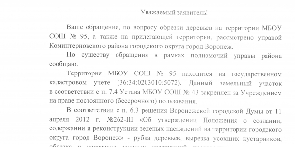 Номер жалобы:22335 Тип жалобы:Иные проблемы ЖКХ Название объекта:Администрация Городского Округа Город Воронеж Город:Воронеж Адрес:Воронеж, улица Владимира Невского, 42 Описание жалобы: сухие деревья во дворе и вокруг школы, которые угрожают жизни и здоровью детей Статус: