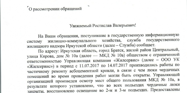 Номер жалобы:22267 Тип жалобы:Иные проблемы ЖКХ Название объекта:ООО УК "Жилсервис" Регион:Иркутская область Город:Братск Адрес:ул. Кирова, 10а Описание жалобы:Во втором подъезде на 5 этаже отсутсвует стекло в оконном проеме, окно забито доской Статус:
