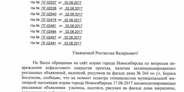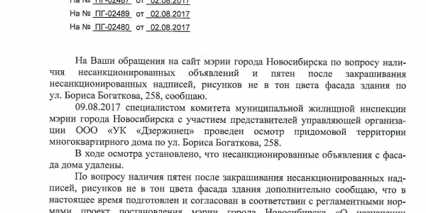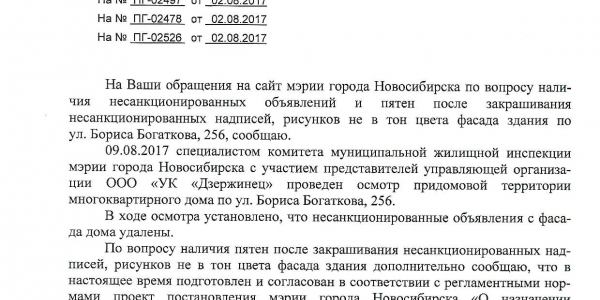 Номер жалобы:22208 Тип жалобы:Иные проблемы ЖКХ Название объекта:Управляющая Компания Город:Новосибирск Адрес:Новосибирск, улица Бориса Богаткова, 256 Описание жалобы:Фасад разрисован Статус: