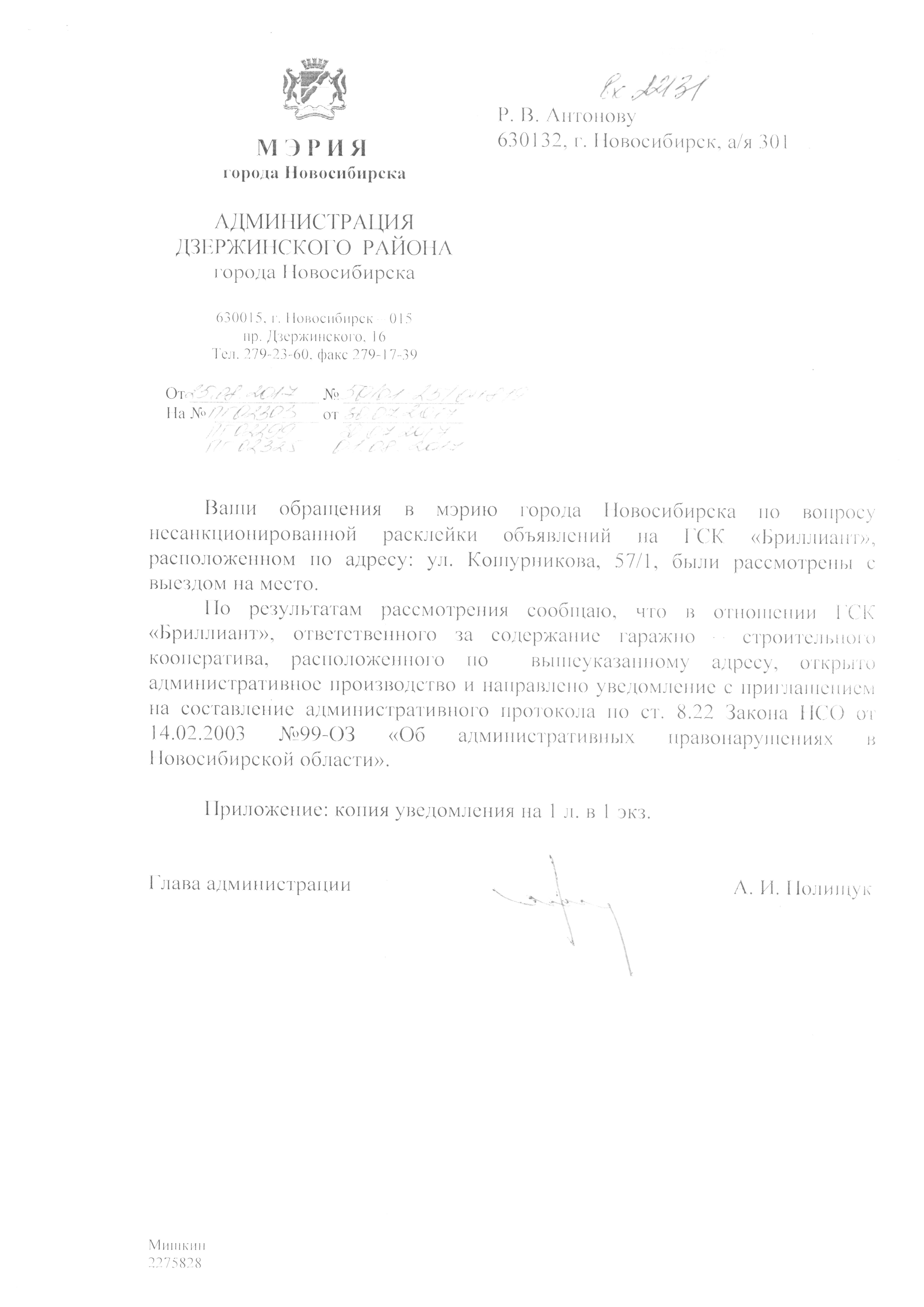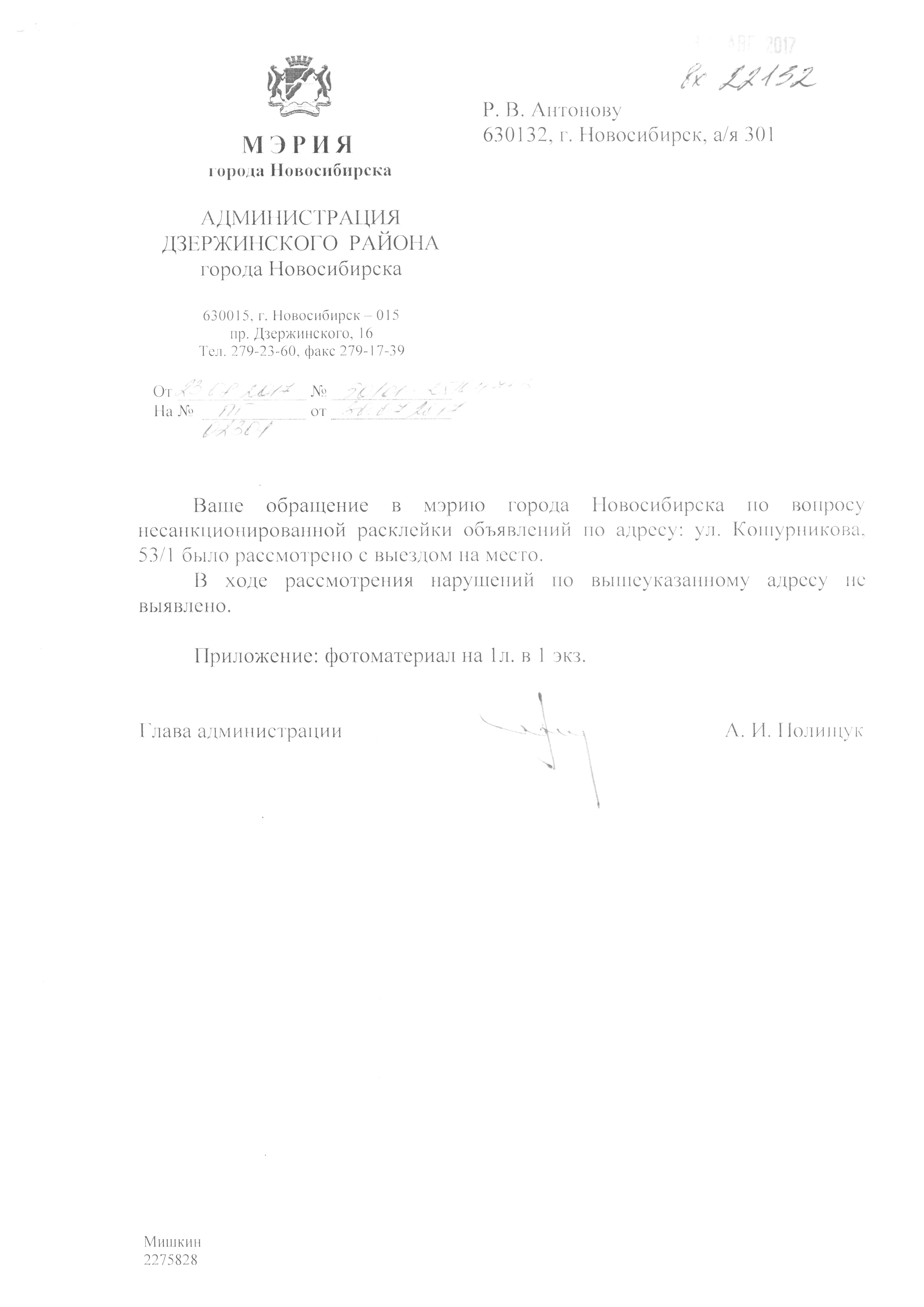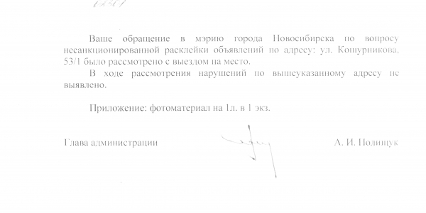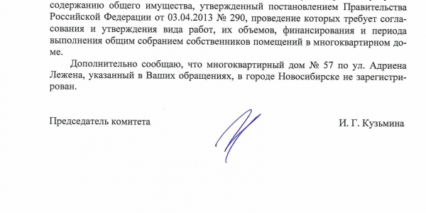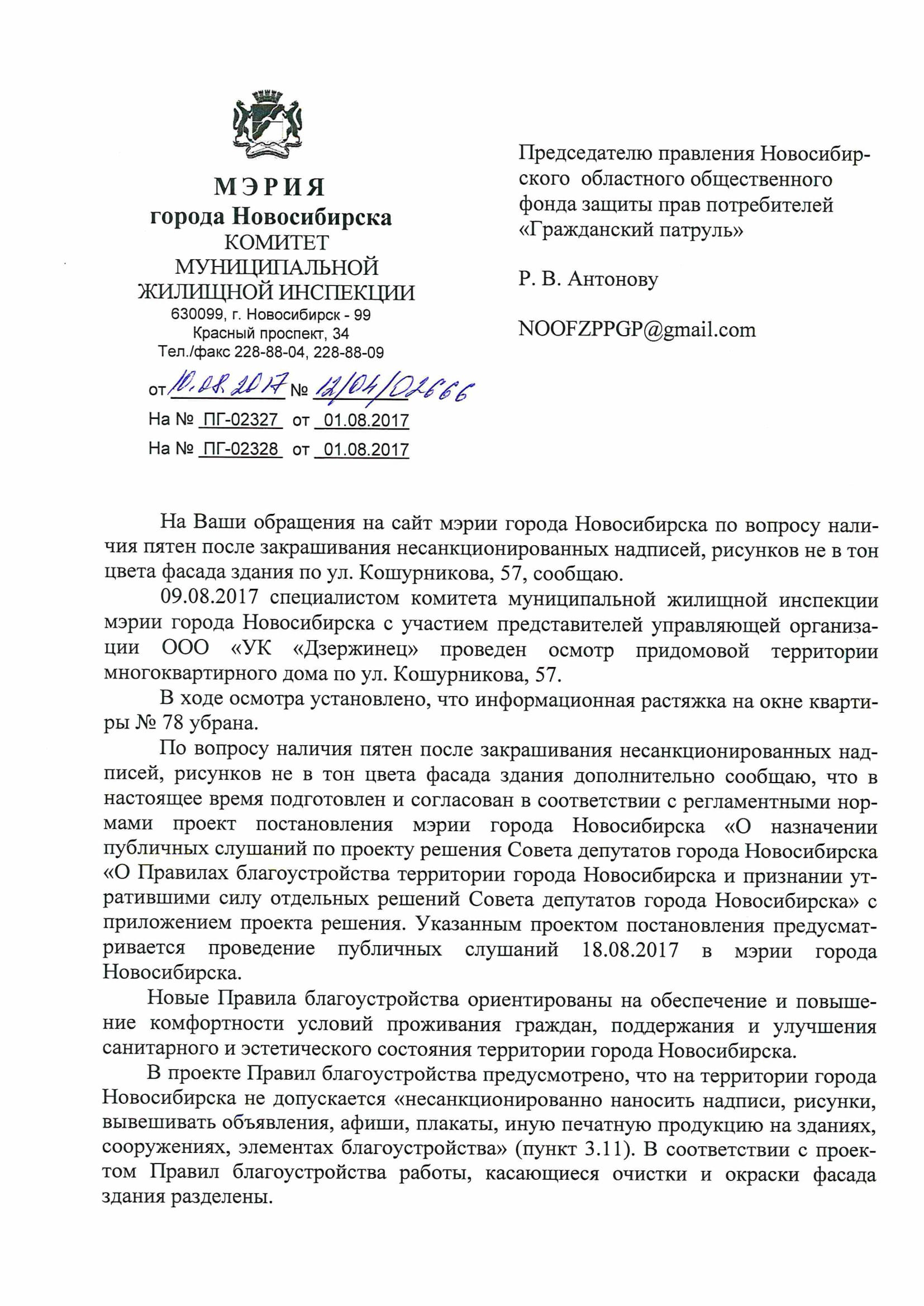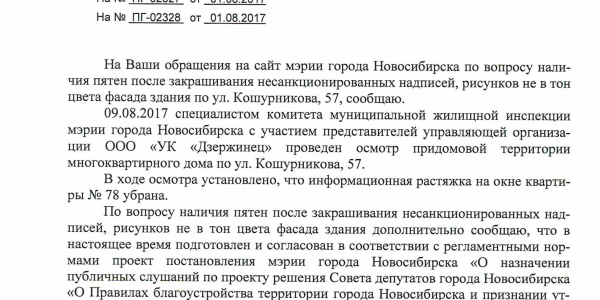 Номер жалобы:22139 Тип жалобы:Иные проблемы ЖКХ Название объекта:Управляющая Компания Город:Новосибирск Адрес:Новосибирск, улица Адриена Лежена, 57 Описание жалобы:Фасад дома разрисован Статус: