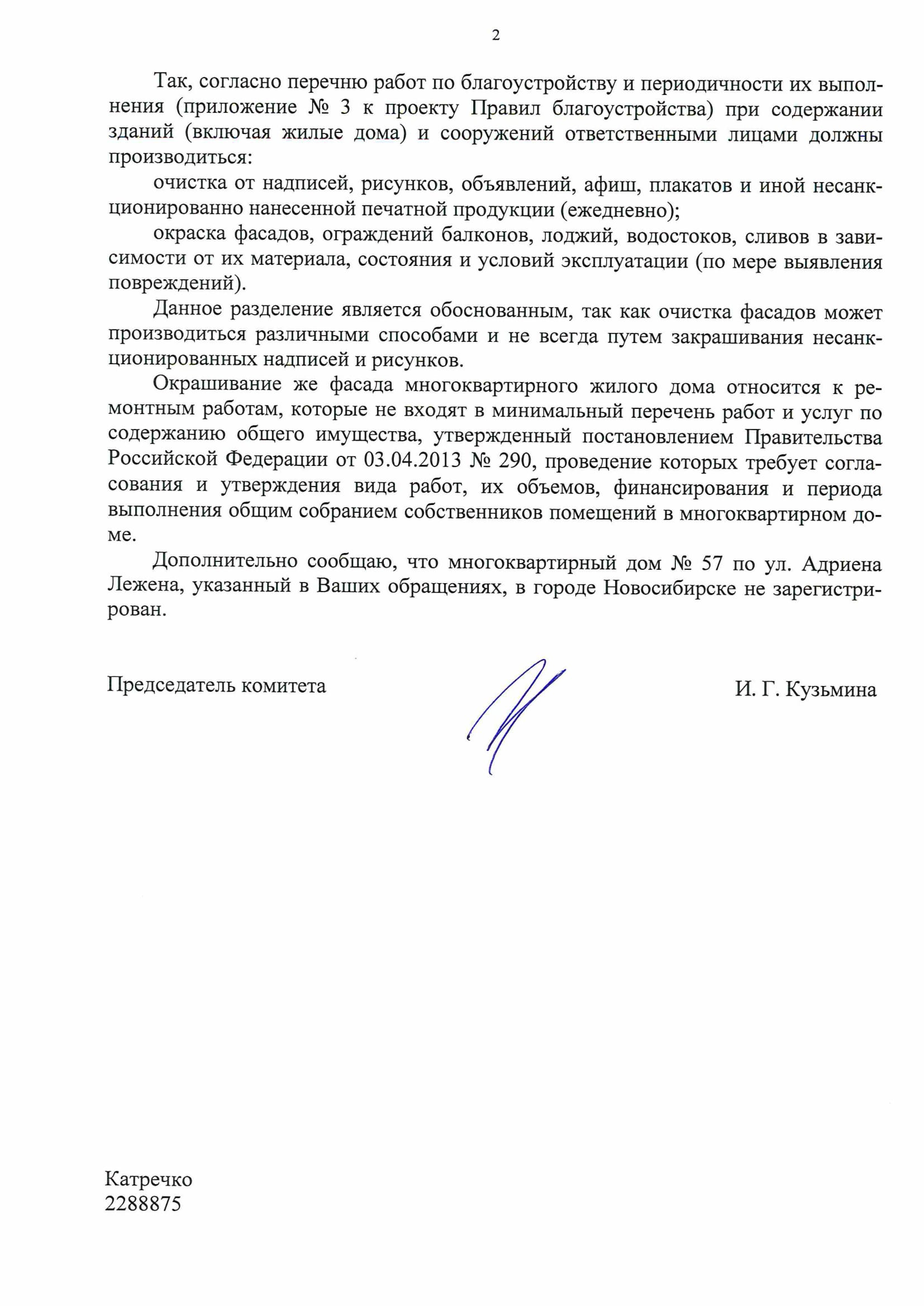 Номер жалобы:22138 Тип жалобы:Иные проблемы ЖКХ Название объекта:Управляющая Компания Город:Новосибирск Адрес:Новосибирск, улица Адриена Лежена, 57 Описание жалобы:Фасад разрисован Статус:
