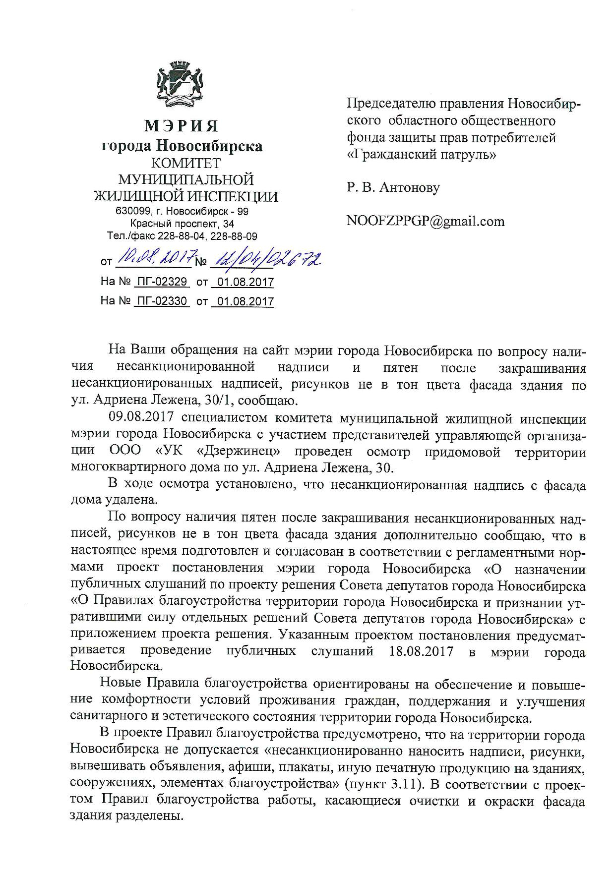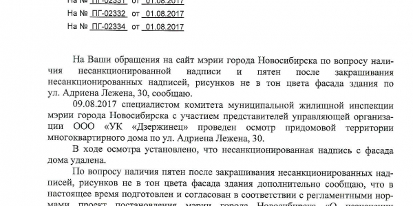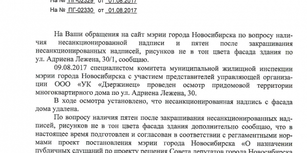 Номер жалобы:22140 Тип жалобы:Иные проблемы ЖКХ Название объекта:Управляющая Компания Город:Новосибирск Адрес:Новосибирск, улица Адриена Лежена, 30/1 Описание жалобы:Фасад дома разрисован Статус: