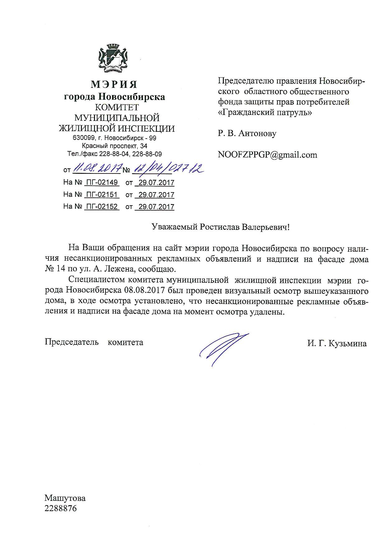 Номер жалобы:22068 Тип жалобы:Иные проблемы ЖКХ Название объекта:Управляющая Компания Город:Новосибирск Адрес:Новосибирск, улица Адриена Лежена, 14 Описание жалобы:Фасад разрисован Статус: