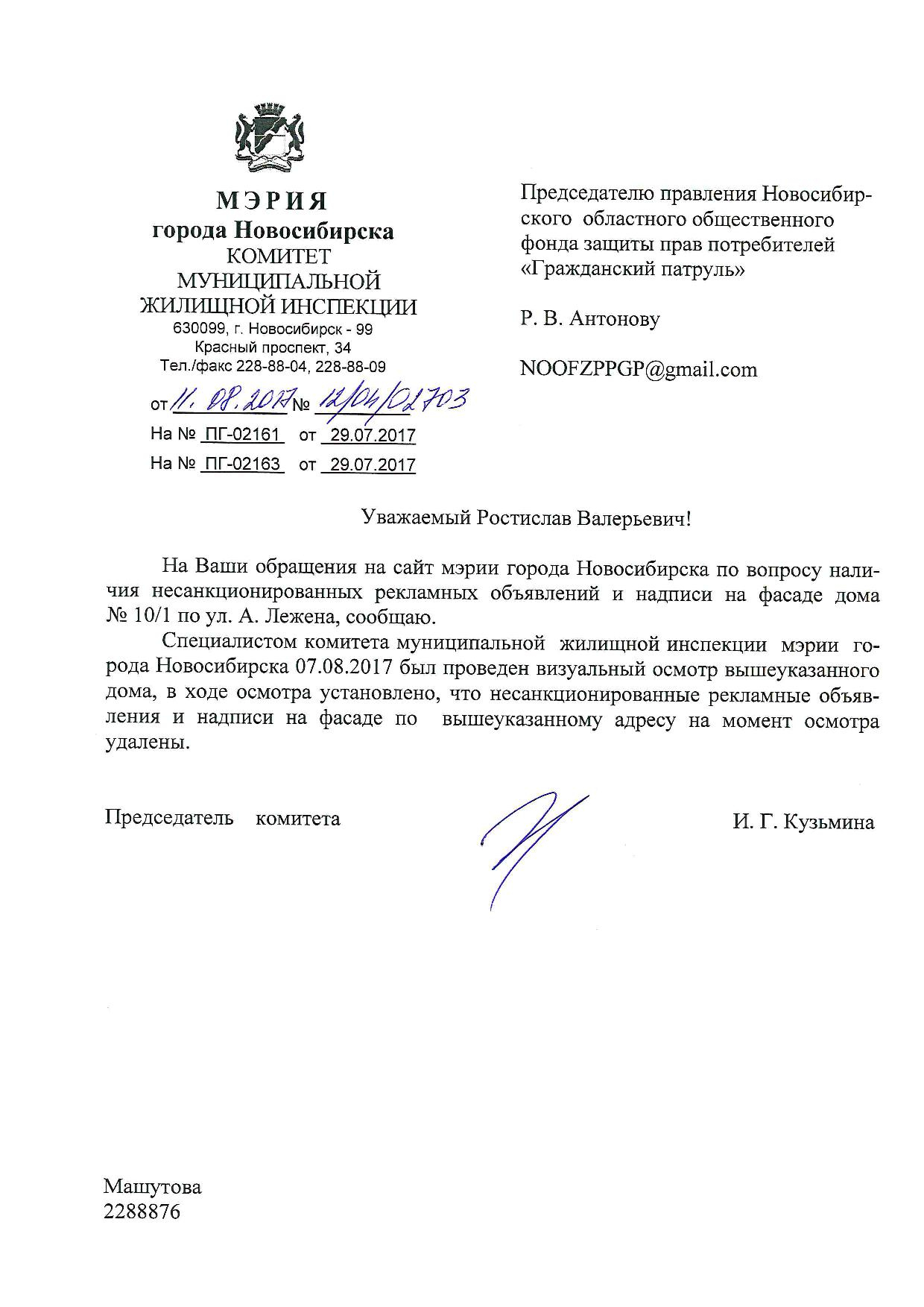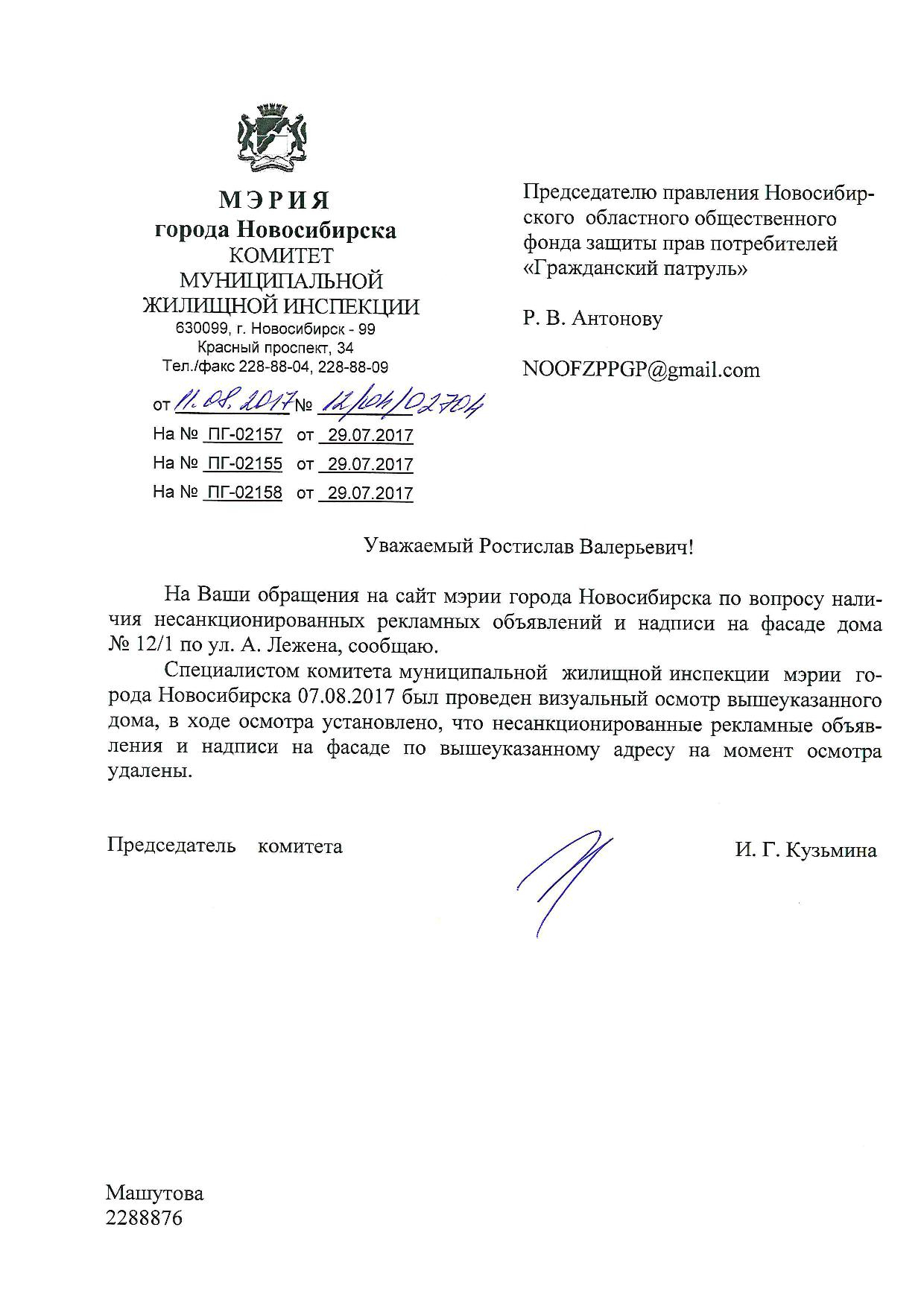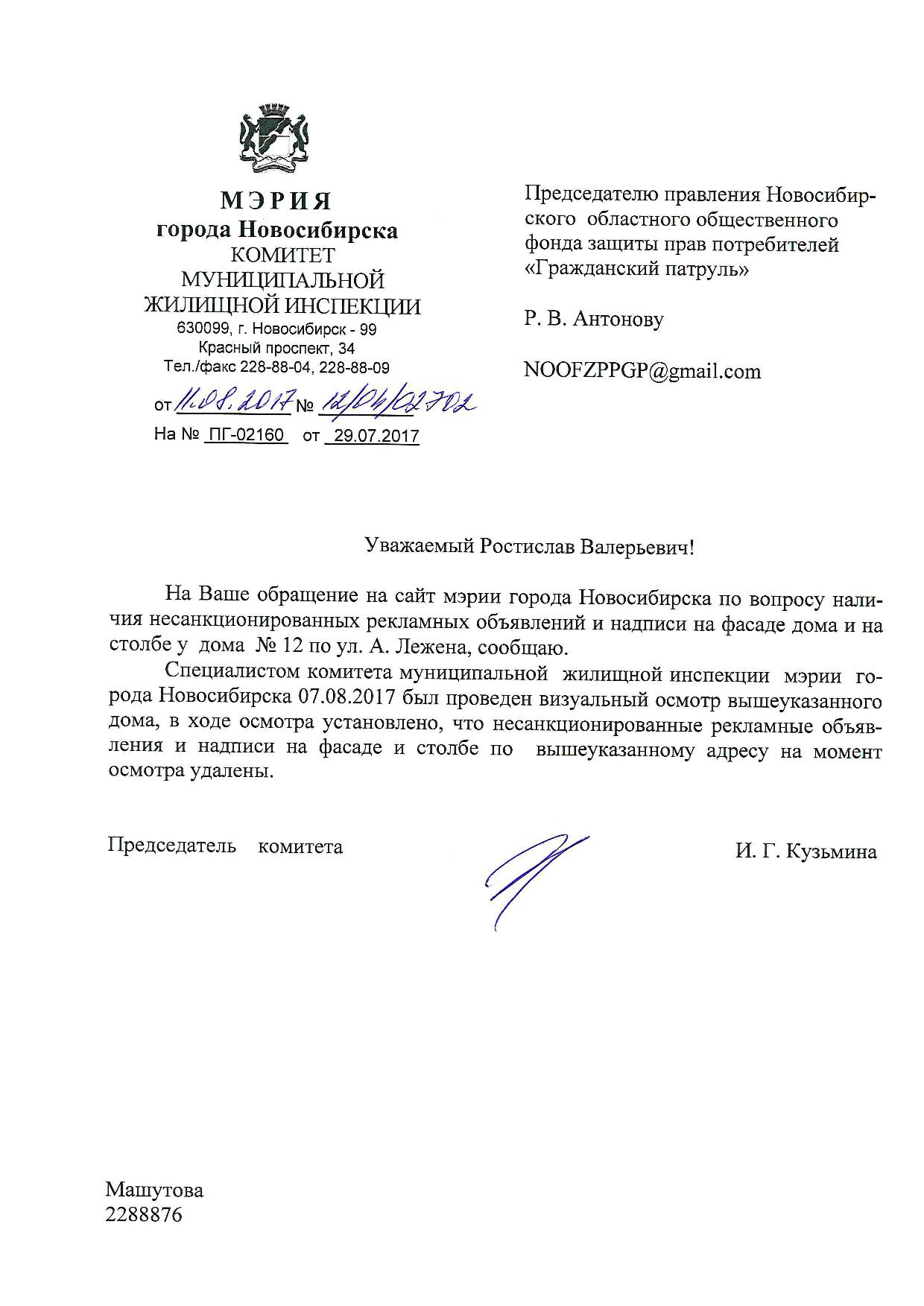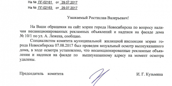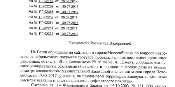 Номер жалобы:22081 Тип жалобы:Иные проблемы ЖКХ Название объекта:Управляющая Компания Город:Новосибирск Адрес:Новосибирск, улица Адриена Лежена, 10/1 Описание жалобы:Фасад дома разрисован Статус: