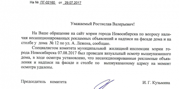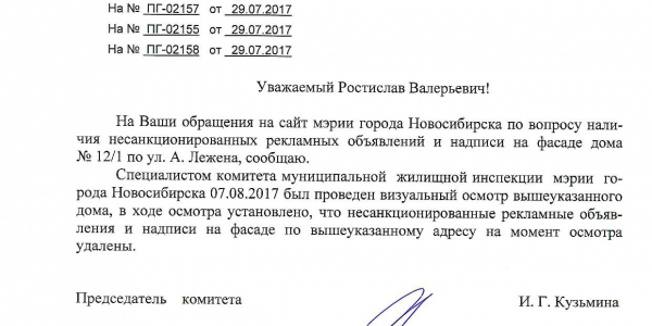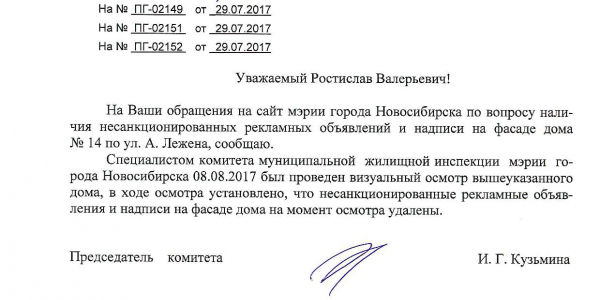Номер жалобы:22078 Тип жалобы:Иные проблемы ЖКХ Название объекта:Управляющая Компания Город:Новосибирск Адрес:Новосибирск, улица Адриена Лежена, 12 Описание жалобы:Фасад дома разрисован Статус: