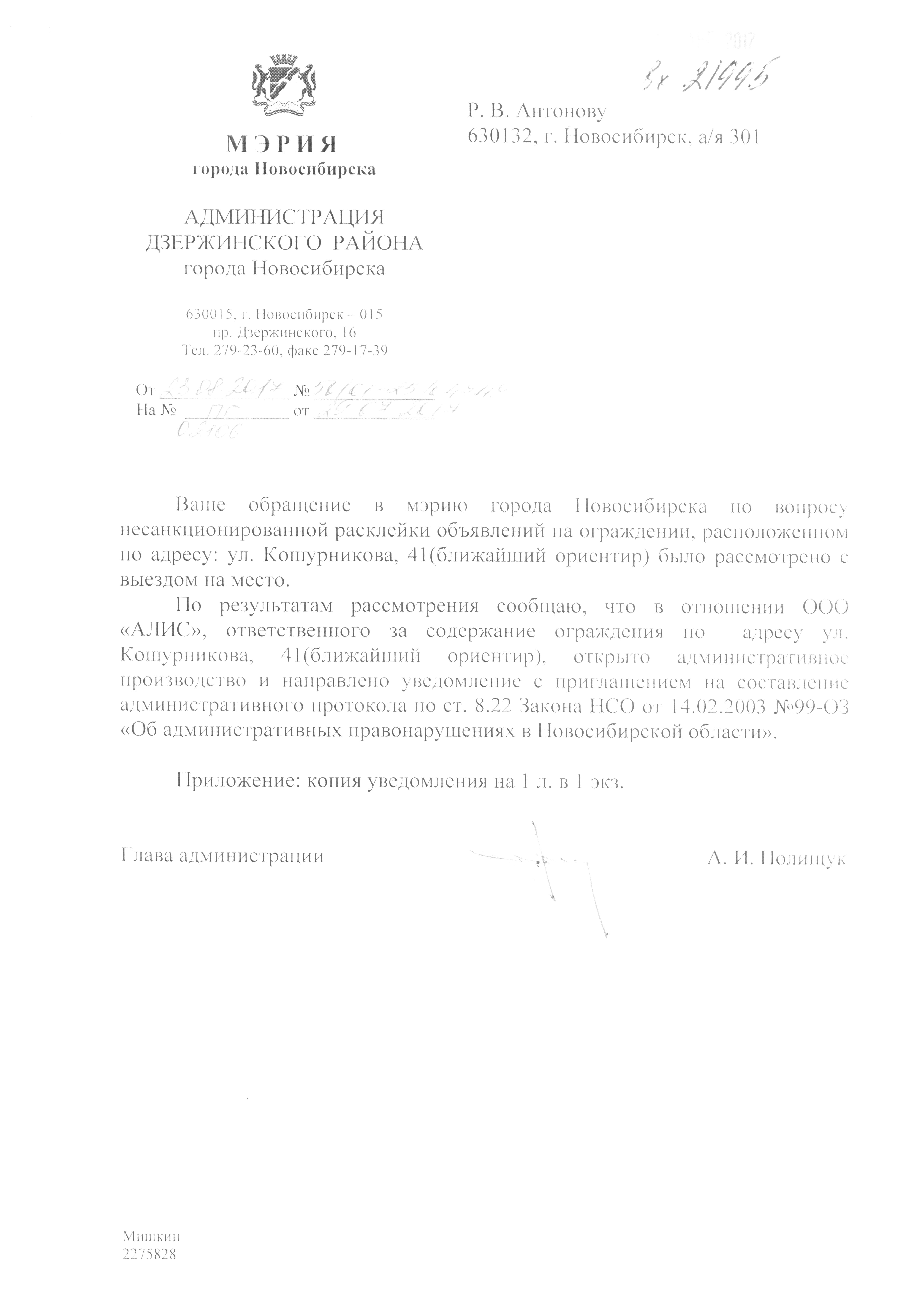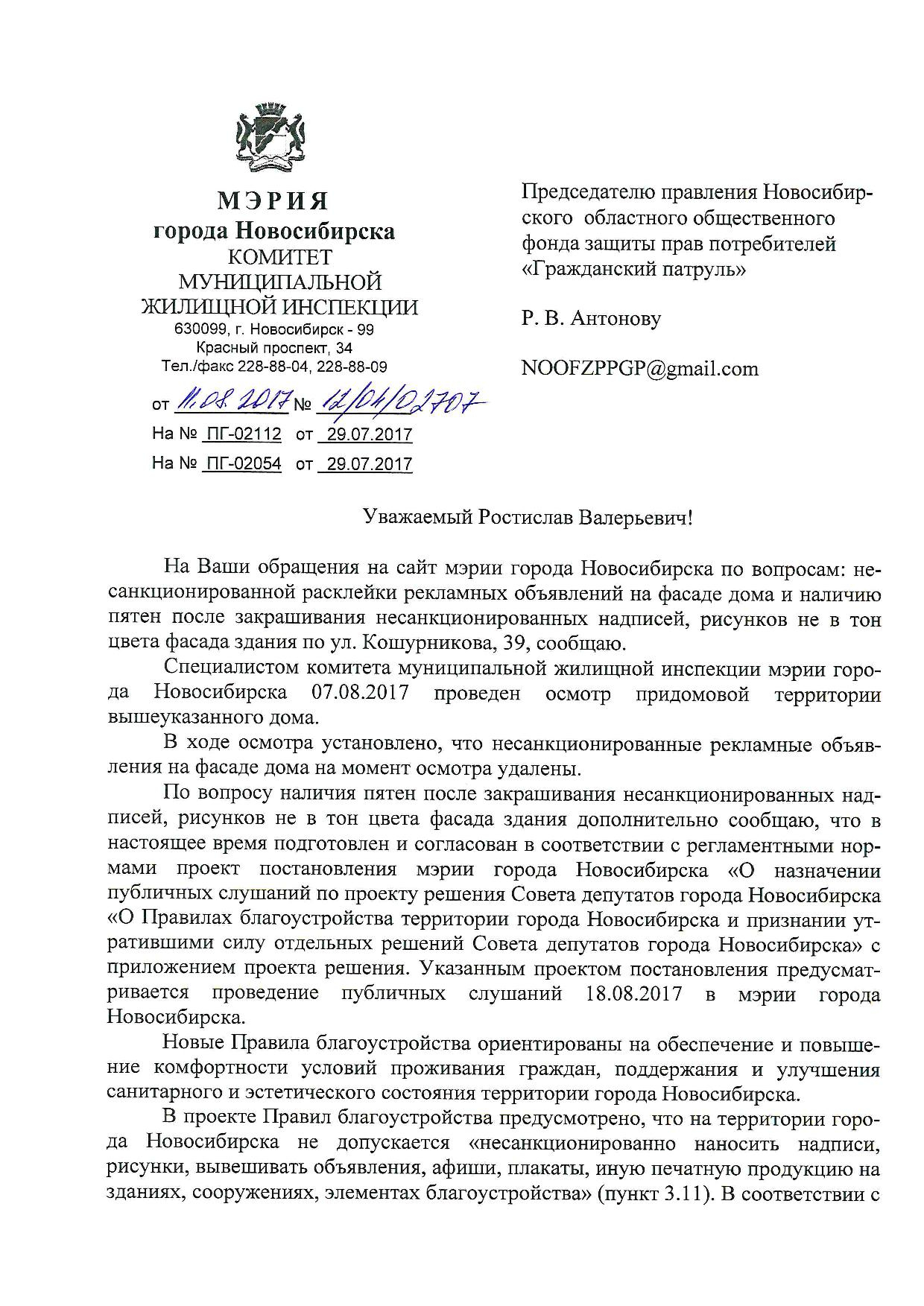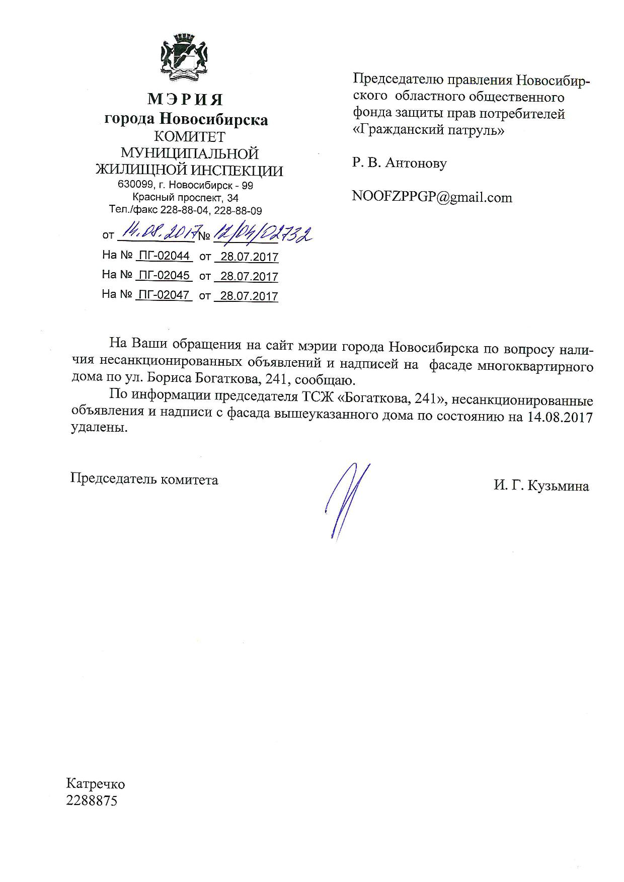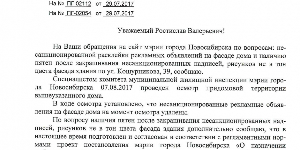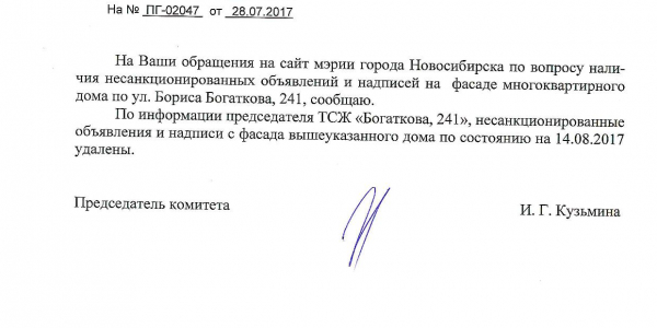 Номер жалобы:22003 Тип жалобы:Иные проблемы ЖКХ Название объекта:Управляющая Компания Город:Новосибирск Адрес:Новосибирск, улица Бориса Богаткова, 241 Описание жалобы:Фасад разрисован Статус: